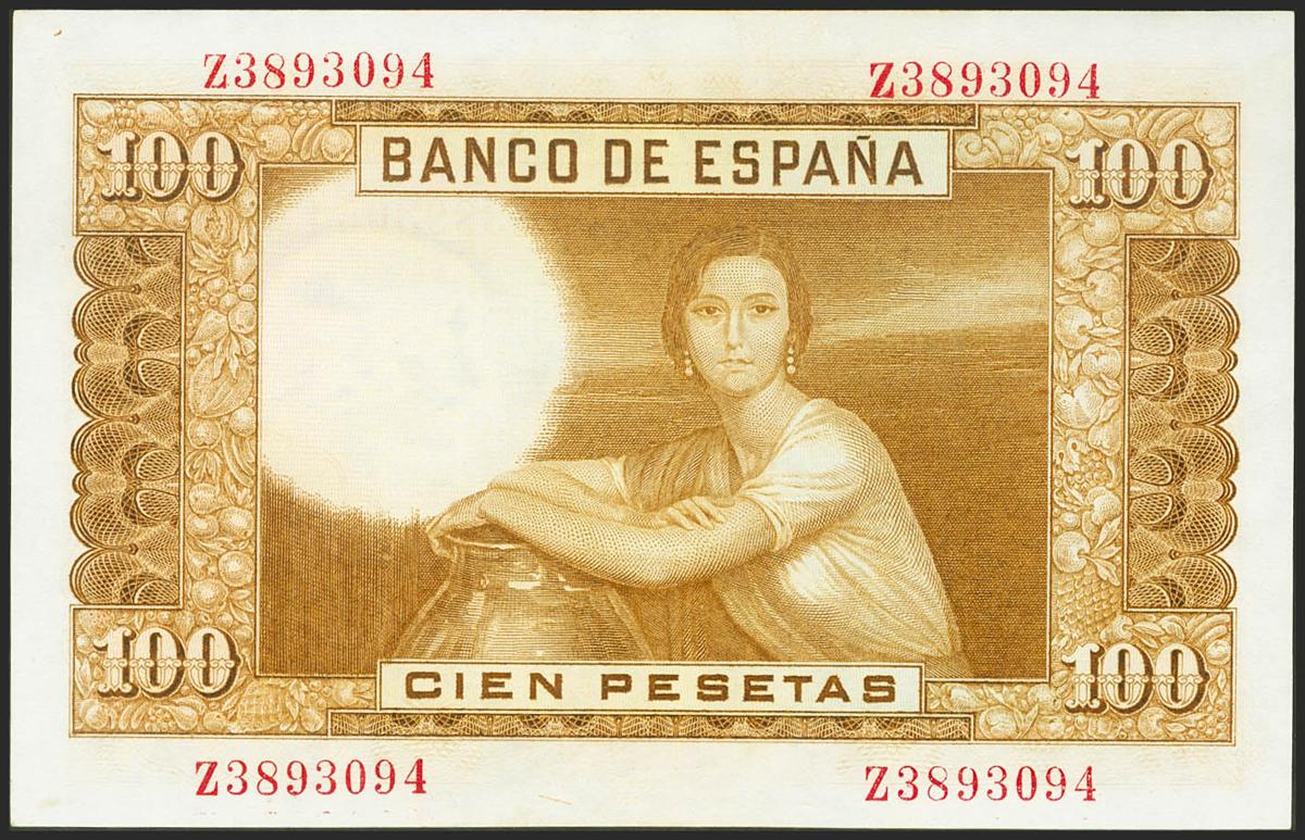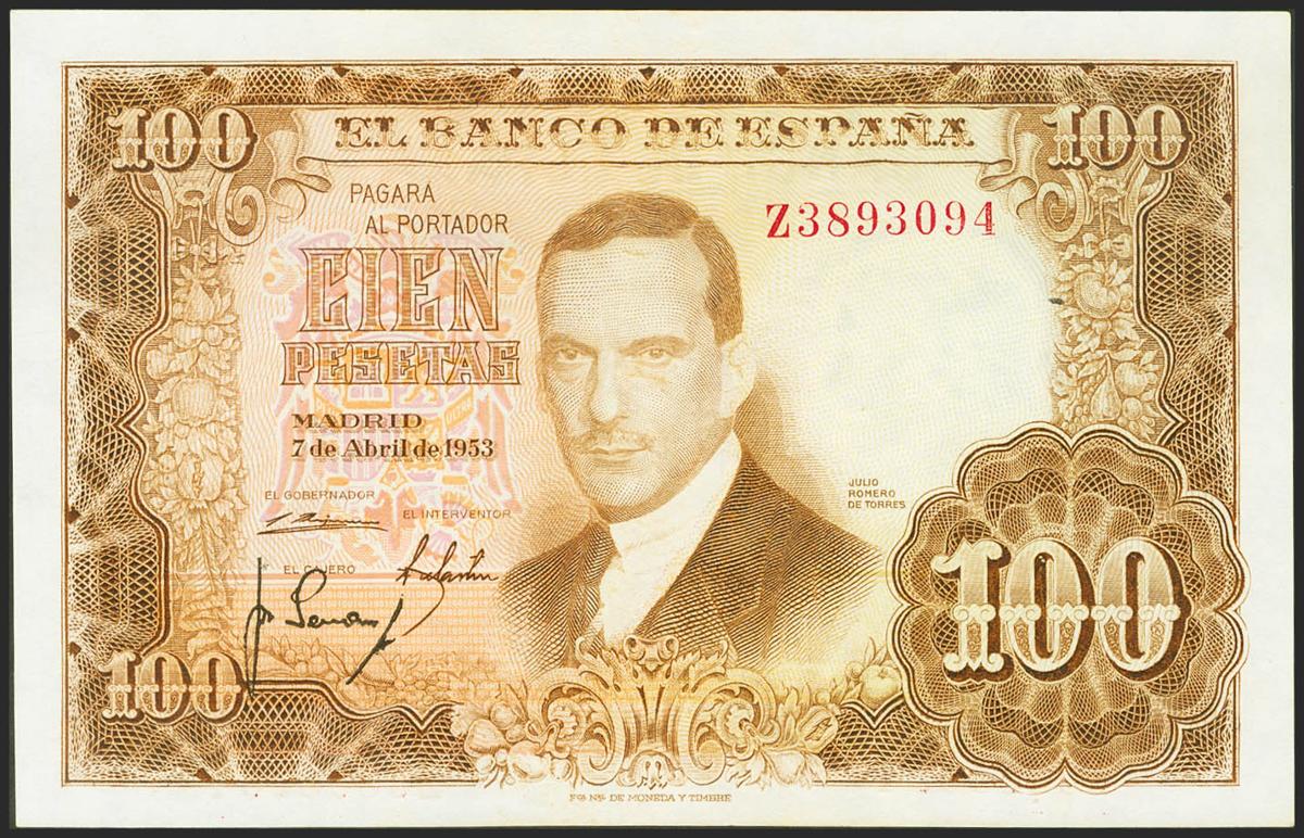 100 pesetas. April 7, 1953. Series Z. (Edifil 2021: 464b). It retains part of its original size. Extremely Fine.