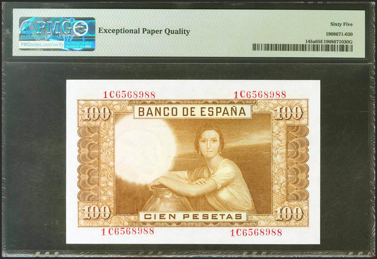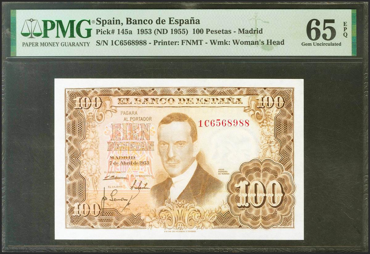 100 pesetas. April 7, 1953. Series 1C. (Edifil 2021: 464c, Pick: 145a). original sizing Uncirculated. PMG65EPQ package.