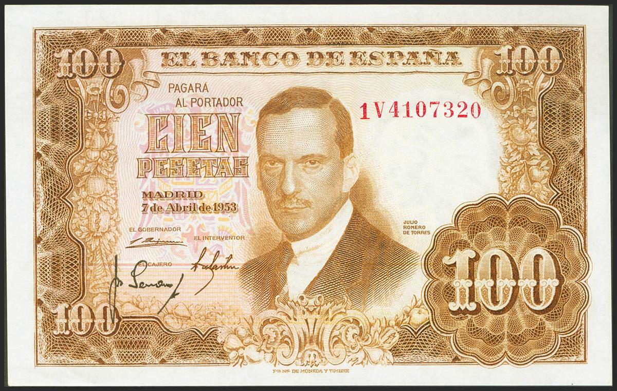 English 100 pesetas. April 7, 1953. Series 1V. (Edifil 2021: 464c). original sizing Almost Uncirculated.