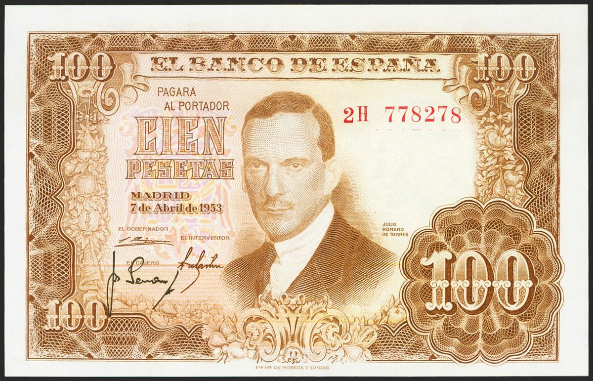 100 pesetas. April 7, 1953. Series 2H. (Edifil 2021: 464c). original sizing Uncirculated.