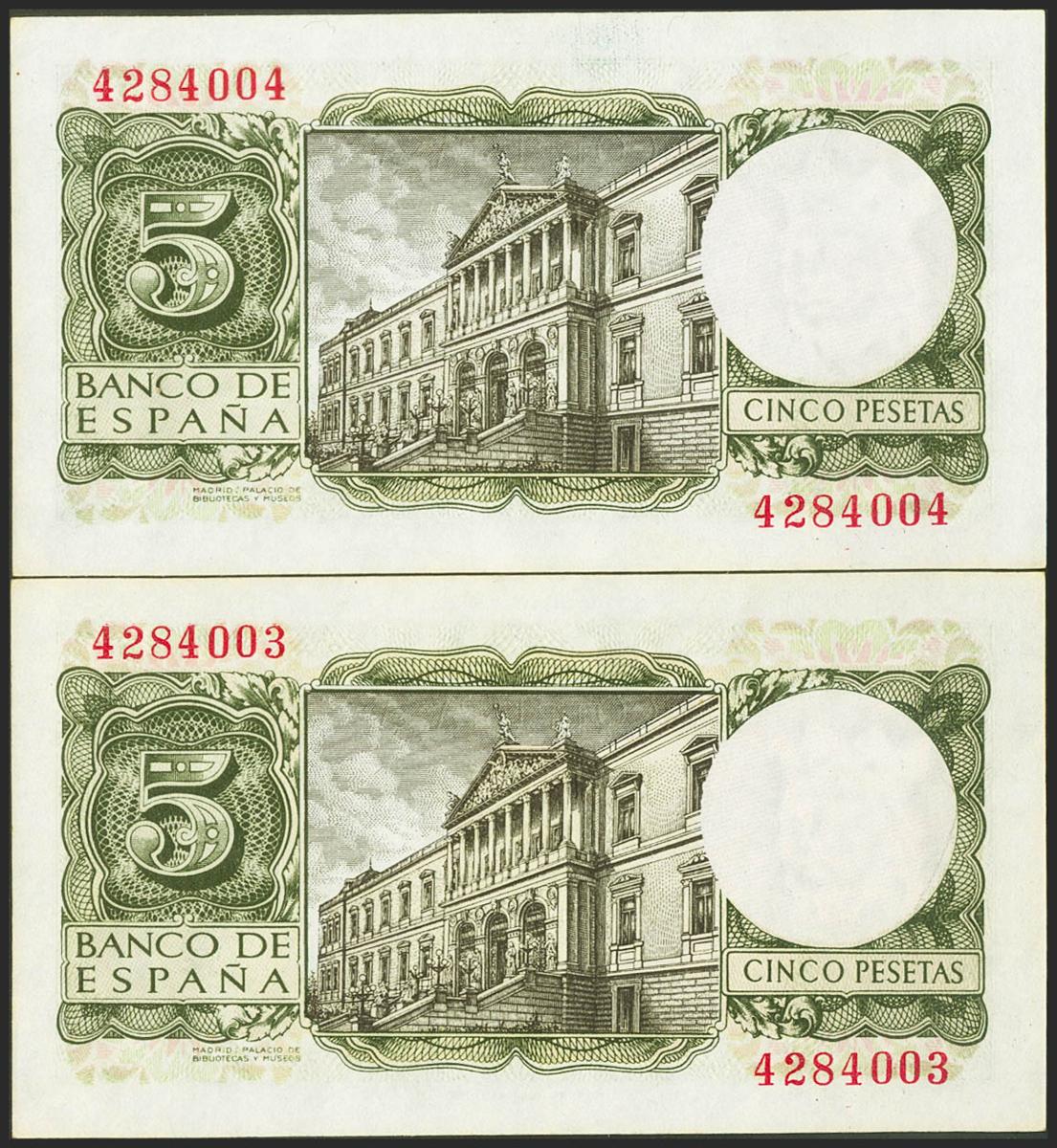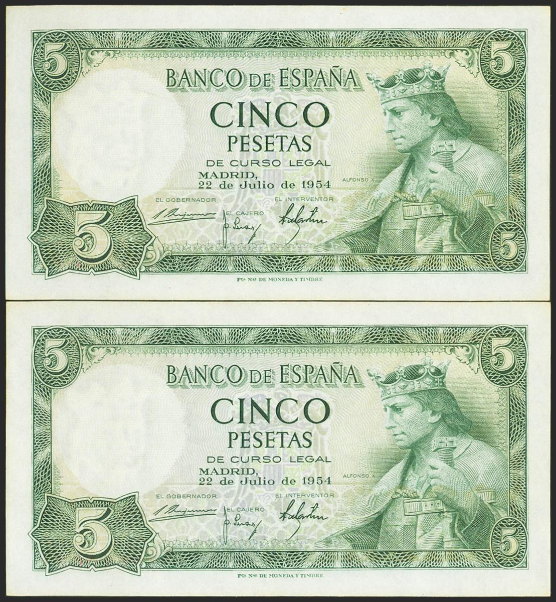 5 pesetas. July 22, 1954. Correlative couple. No serie. (Edifil 2021: 466). It preserves all the original sizing and shades of time. Almost Uncirculated.