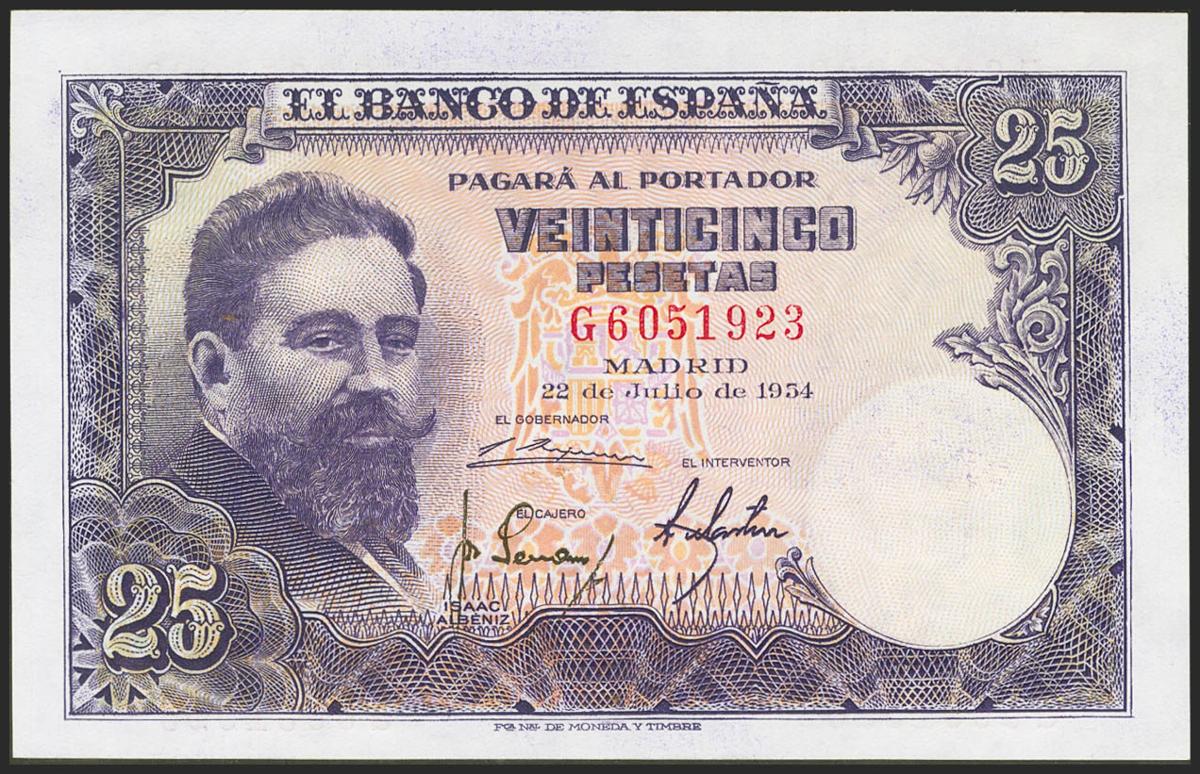 English 25 pesetas. July 22, 1954. Series G. (Edifil 2021: 467a). It retains all its original sizing. Uncirculated.