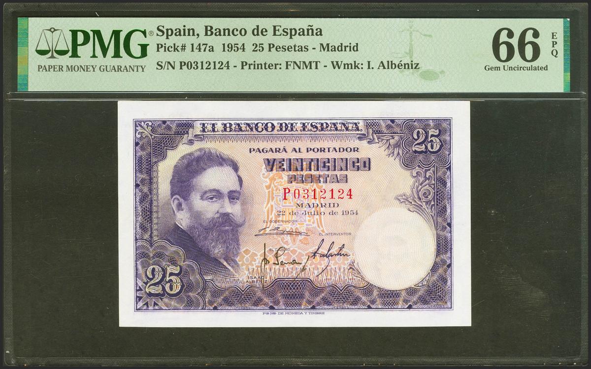 25 pesetas. July 22, 1954. Series P, last series issued. (Edifil 2021: 467b, Pick: 147a). Very rare series, especially in this exceptional quality, original sizing. Uncirculated. PMG66EPQ package.