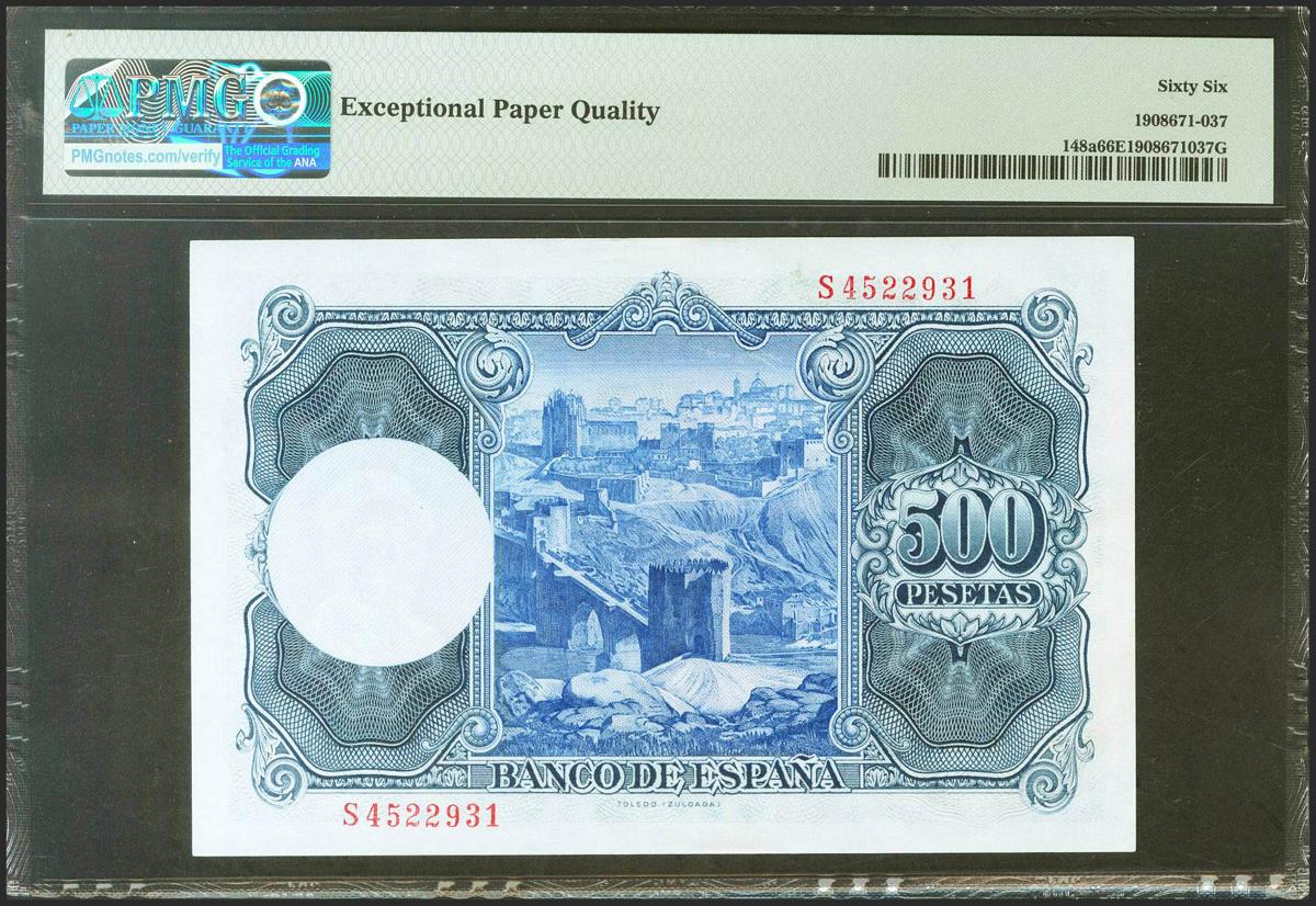500 pesetas. July 22, 1954. Series S. (Edifil 2021: 468b, Pick: 148a). Rare in this exceptional quality, original sizing. Uncirculated. PMG66EPQ package.
