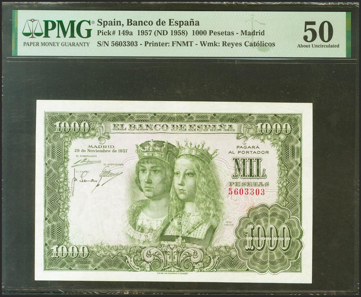 1000 pesetas. November 22, 1957. No series. (Edifil 2021: 469, Pick: 149a). Unusual. Extremely Fine. PMG50 package.