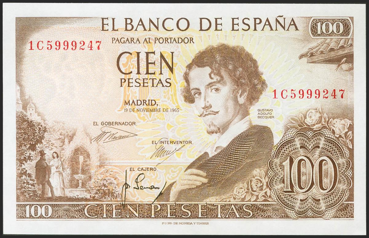 100 pesetas. November 19, 1965. Series 1C. (Edifil 2021: 470a). It retains all its original sizing. Uncirculated.
