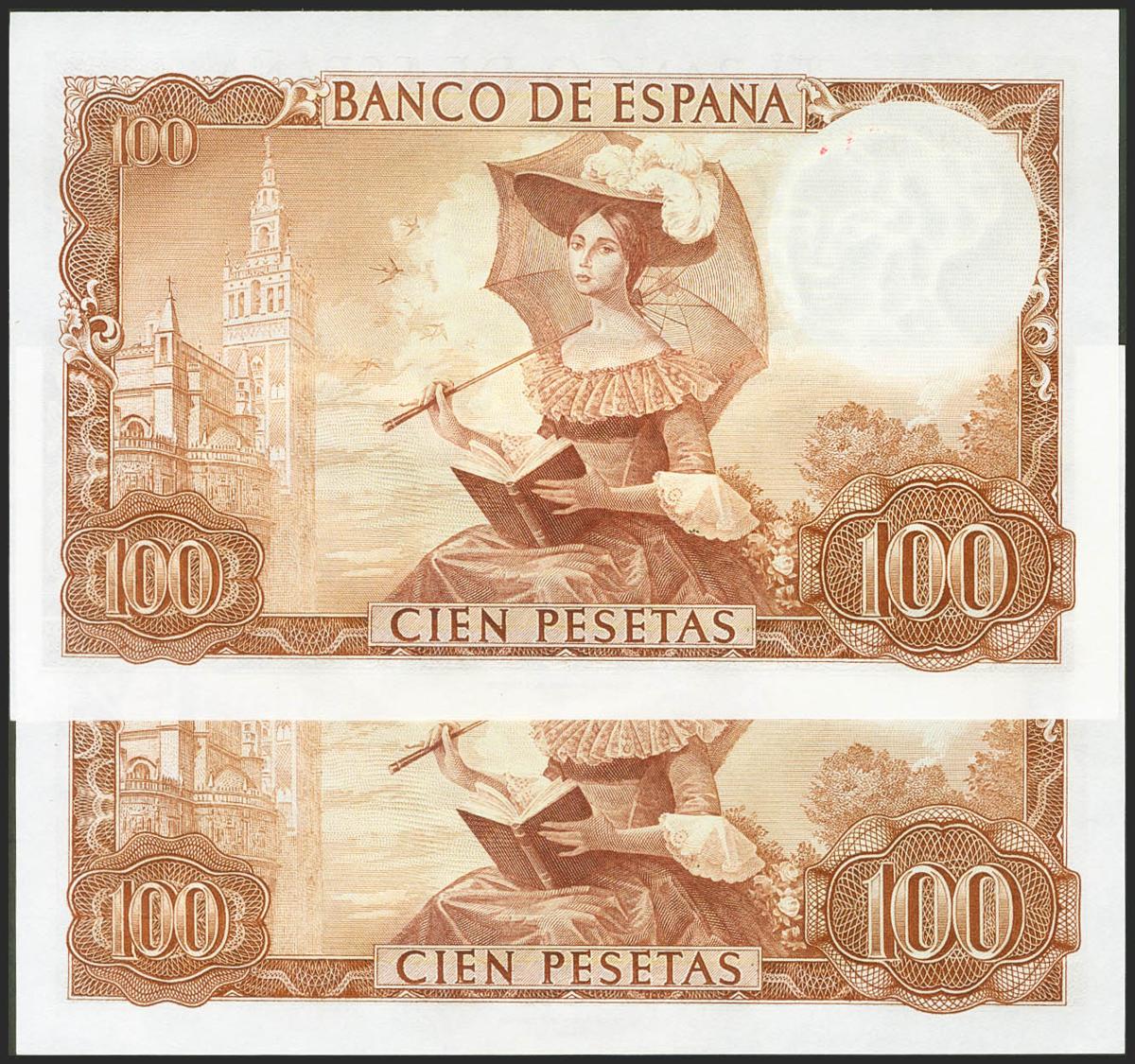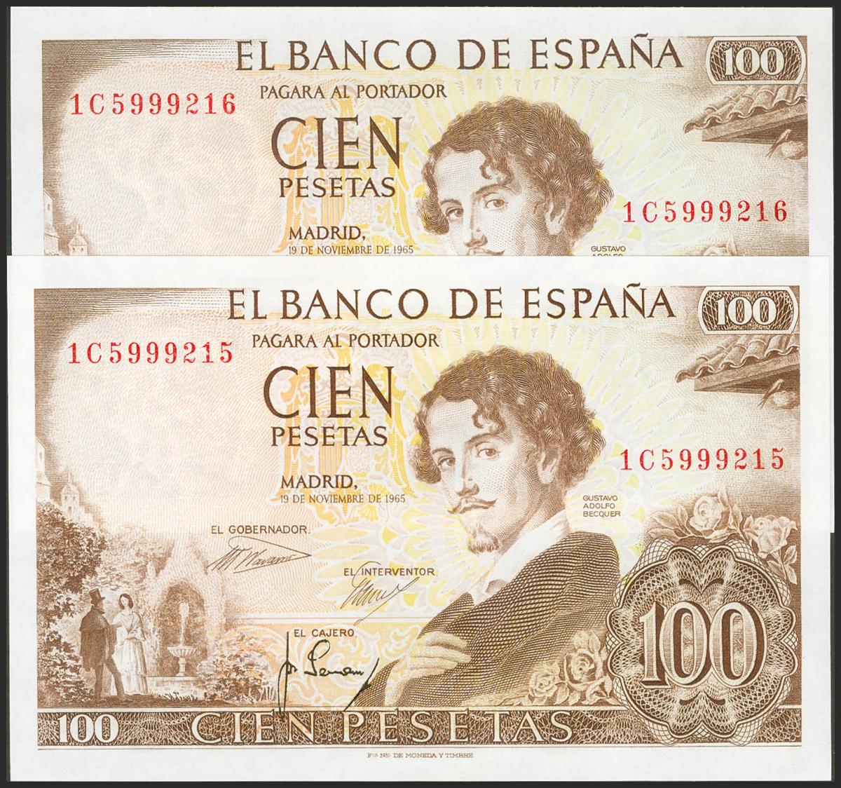 English 100 pesetas. November 19, 1965. Correlative couple. 1C series. (Edifil 2021: 470a). It retains all its original sizing. Uncirculated.
