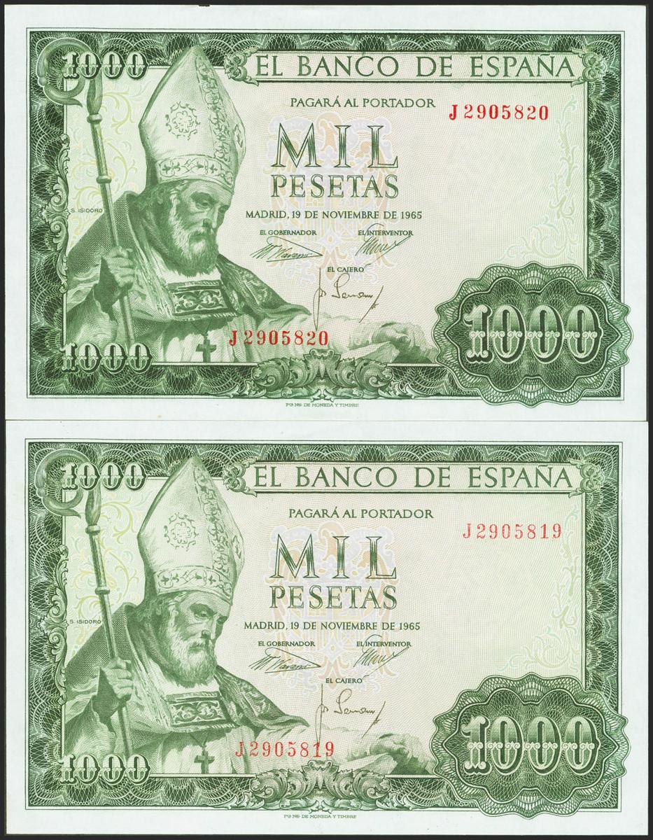 1000 pesetas. November 19, 1965. Correlative couple. Series J and with the curiosity of the numbers stamped with different shades (dyes) of color. (Edifil 2021: 471b). Preserving all its original sizing. Uncirculated.