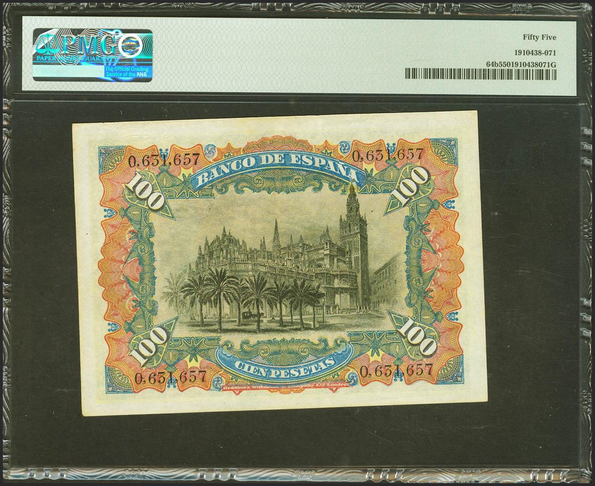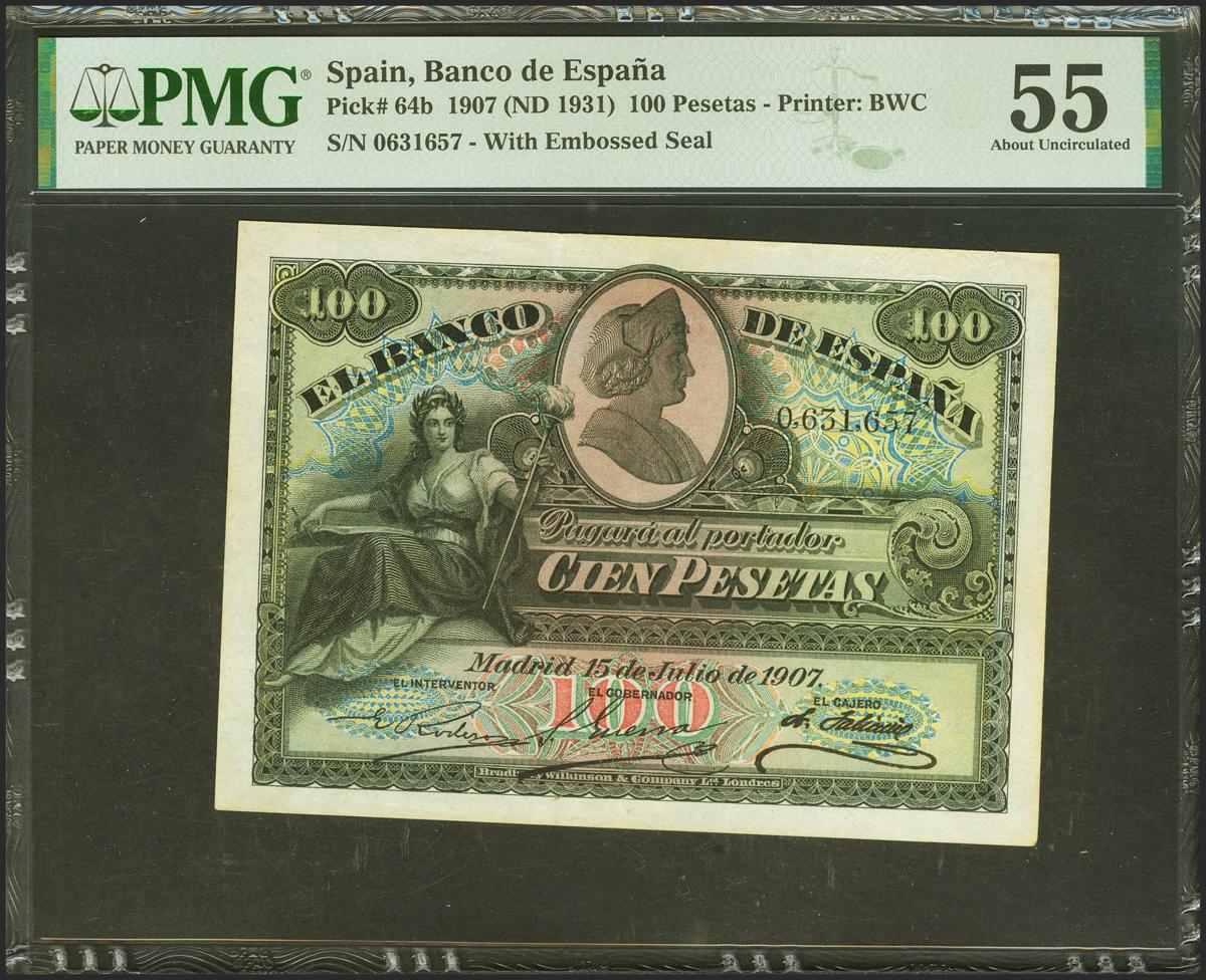 100 pesetas. July 15, 1907. Without series and dry stamp "Provisional Government of the Republic / April 14, 1931". (Edifil 2021: 343, Pick: 64b). Unusual. Good Extremely Fine. PMG55 package.