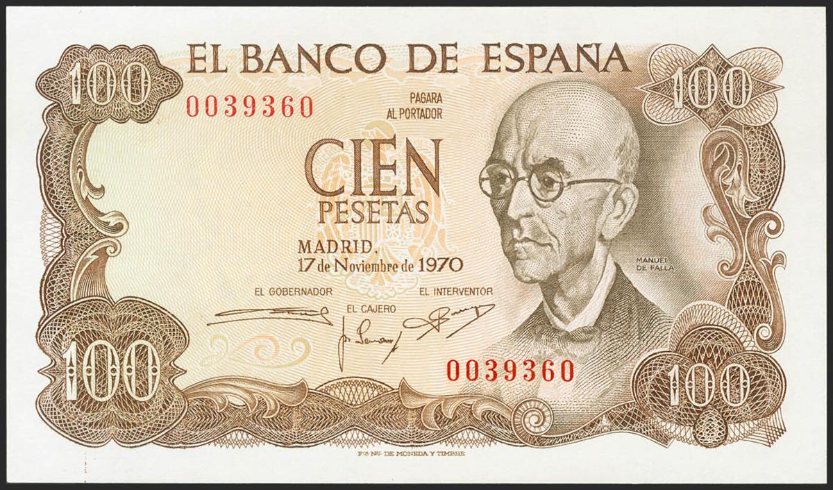 100 pesetas. November 17, 1970. Without series, with low numbering. (Edifil 2021: 472). It retains part of its original size. EBC+++.