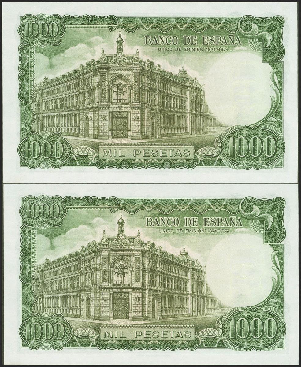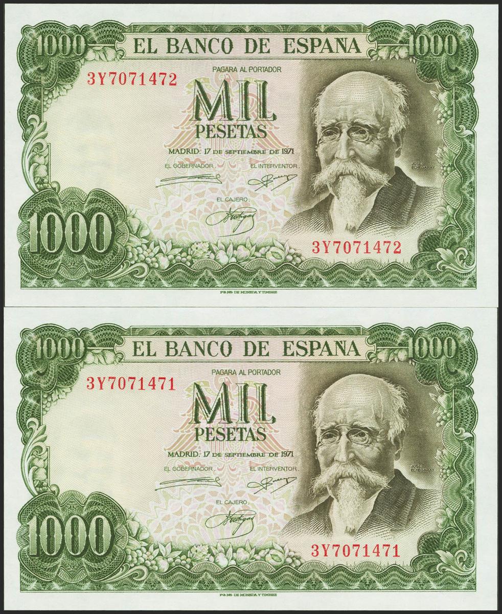 1000 pesetas. September 17, 1971. Correlative couple. 3Y series. (Edifil 2021: 474c). It retains all its original sizing. Uncirculated.
