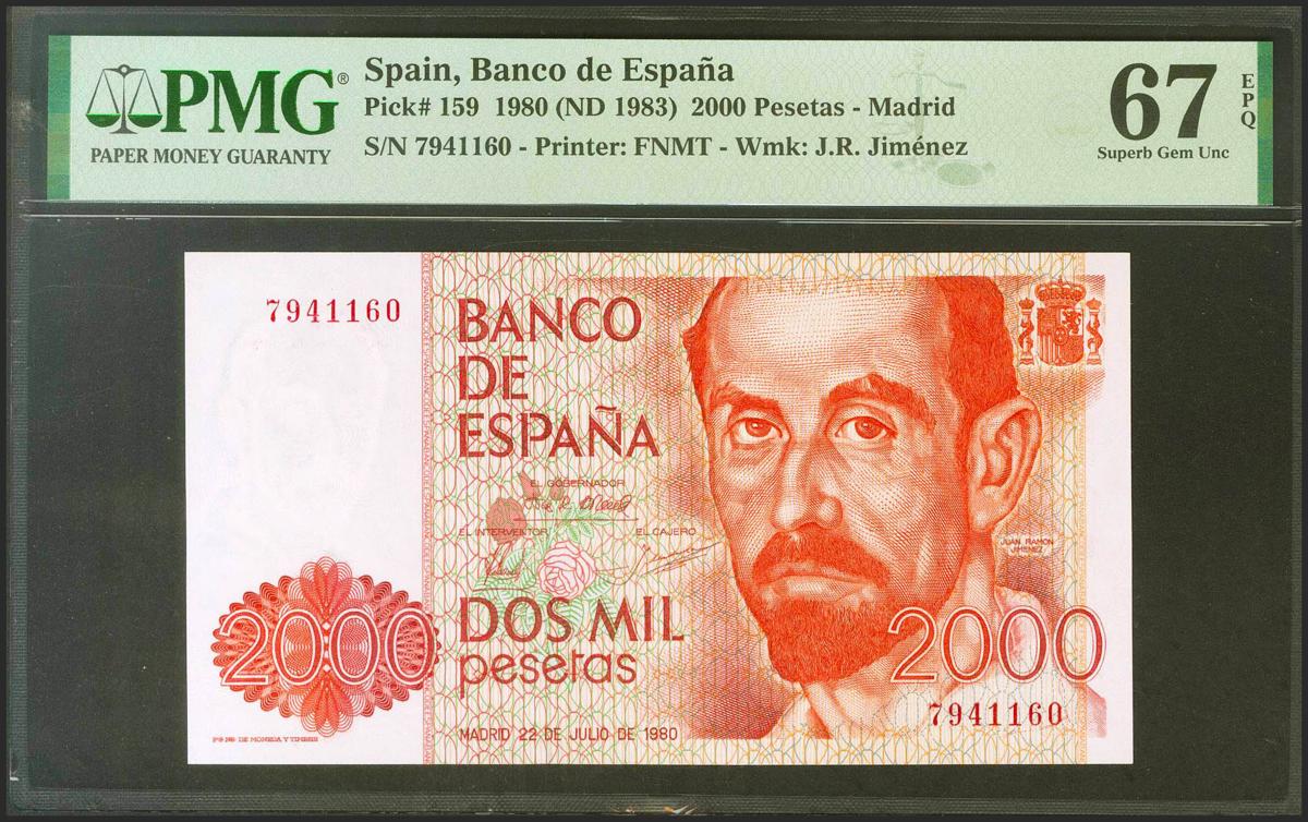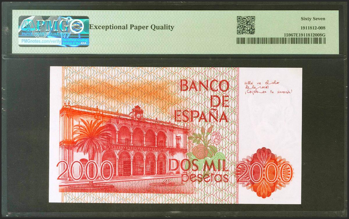 2000 pesetas. July 22, 1980. No series. (Edifil 2021: 479, Pick: 159). Rare in this exceptional quality, original sizing. Uncirculated. PMG67EPQ package.