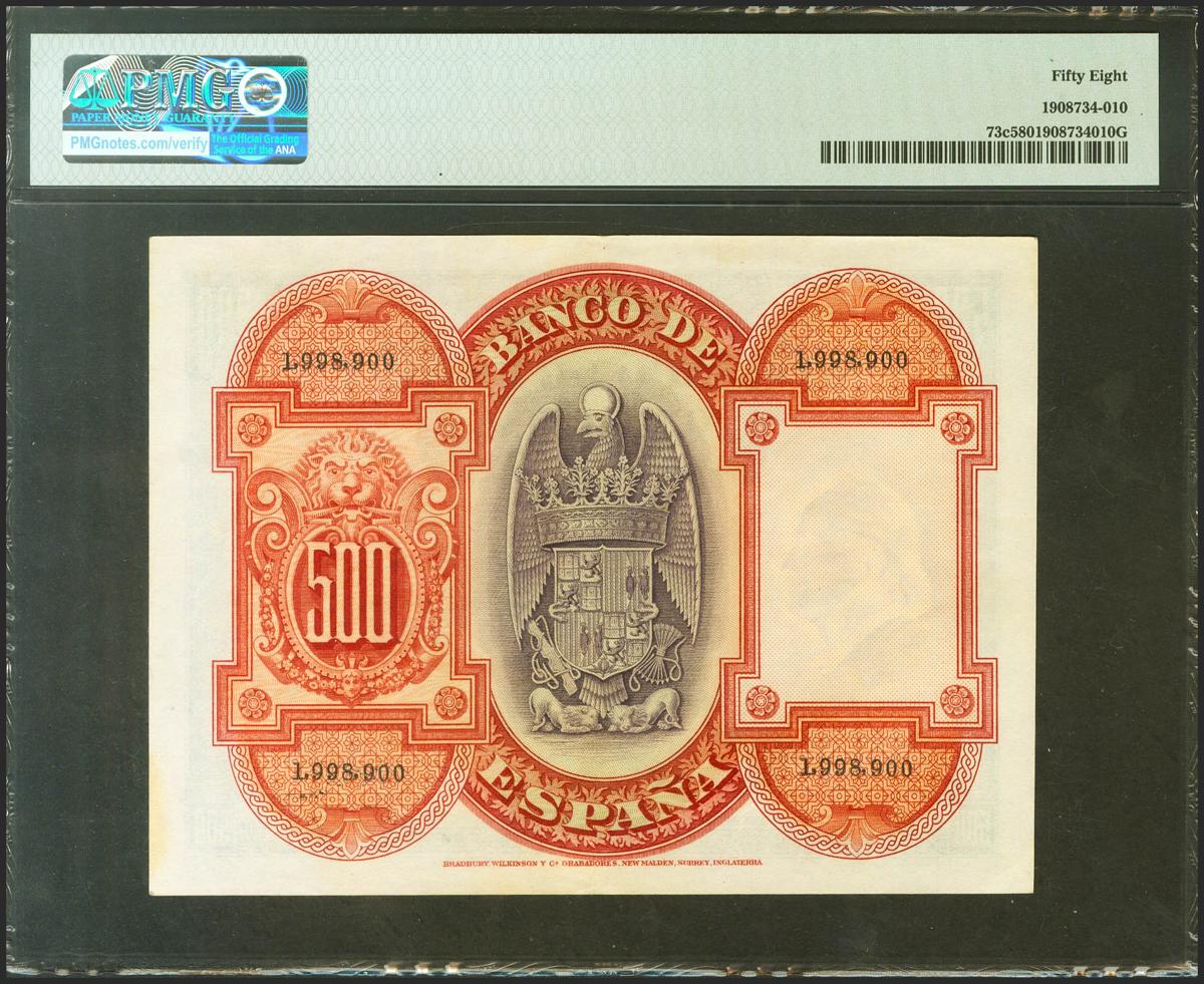 500 pesetas. July 24, 1927. Without series and subsequent numbering 1602000. (Edifil 2021: 352, Pick: 73c). Rare in this quality. EBC++. PMG58 encapsulation.