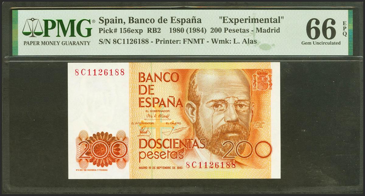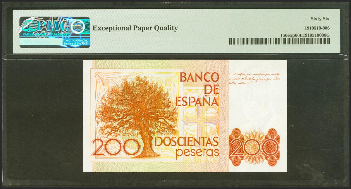 English 200 pesetas. September 16, 1980. Special series 8C. (Edifil 2021: 480c, Pick: 156exp). Very rare in this exceptional quality. Uncirculated. PMG66EPQ package.
