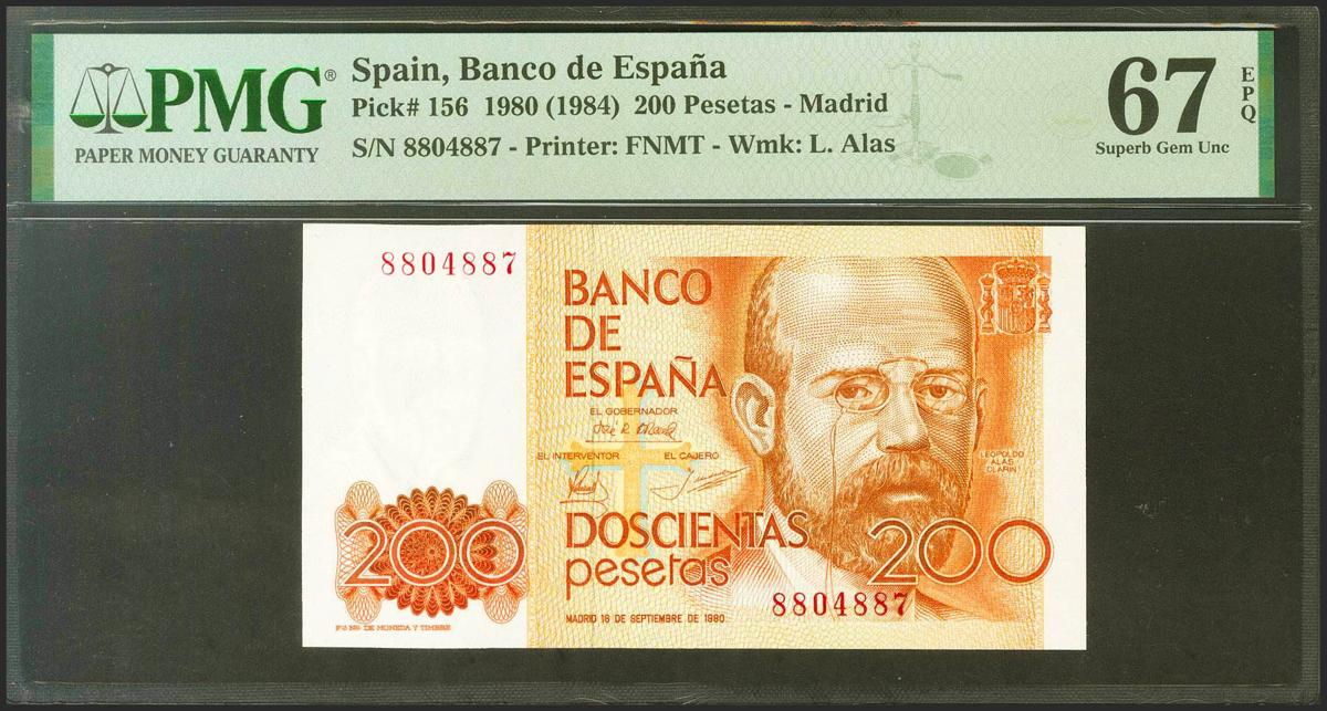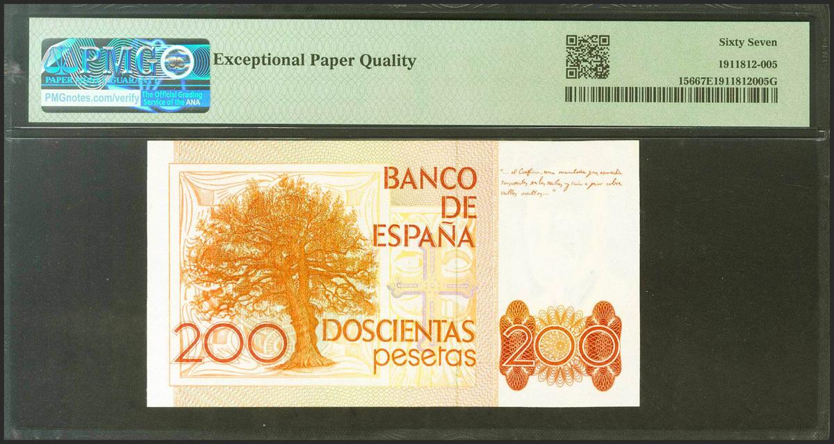 200 pesetas. September 16, 1980. No series. (Edifil 2021: 480, Pick: 156). Rare in this exceptional quality, original sizing. Uncirculated. PMG67EPQ packages.