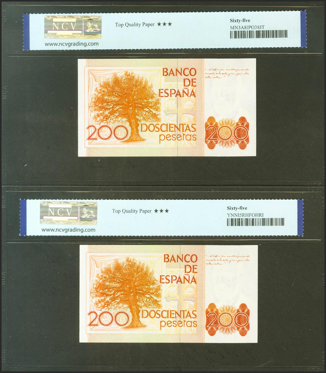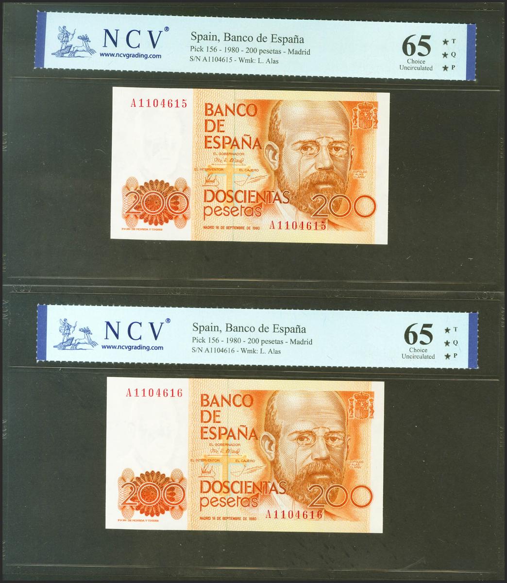 200 pesetas. September 16, 1980. Correlative couple. Series A. (Edifil 2021: 480a, Pick: 156). original sizing Uncirculated. NCV65TQP package, both.