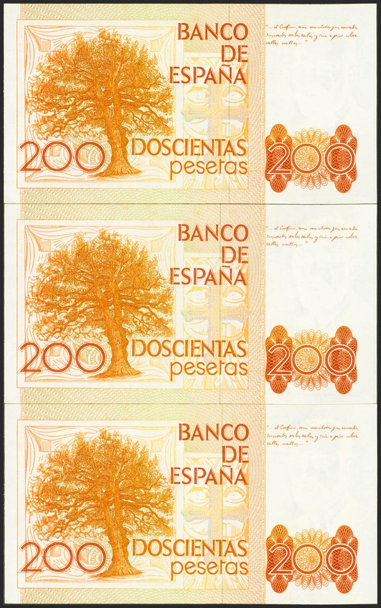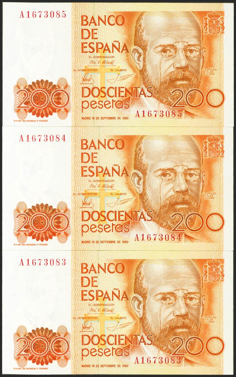 Set of 3 correlative banknotes of 200 Pesetas, issued on September 16, 1980, all of them with the A series. (Edifil 2021: 480a). Uncirculated/ Good Extremely Fine.