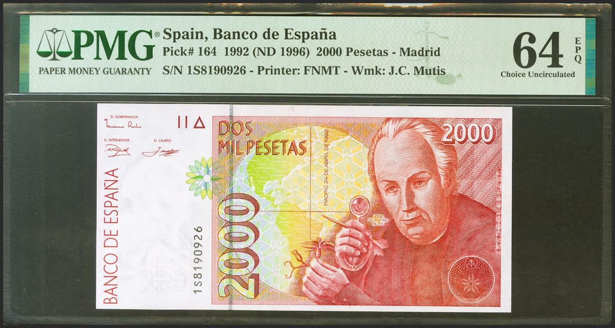 2000 pesetas. April 24, 1992. Series 1S. (Edifil 2021: 482A, Pick: 164). Rare in this exceptional quality, original sizing. Uncirculated. PMG64EPQ package.