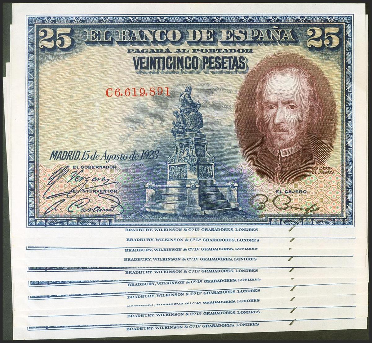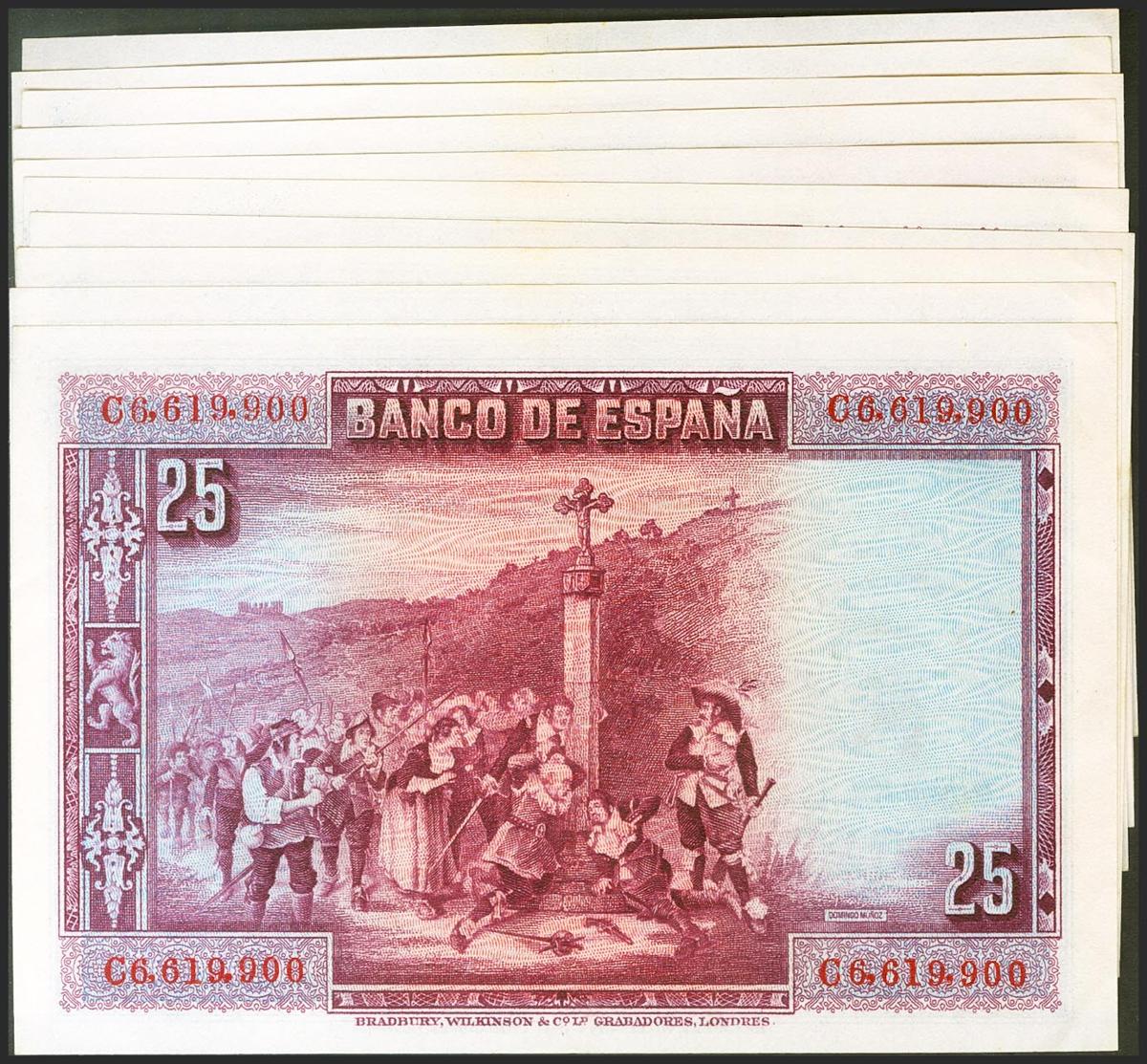 Precious set of 10 correlative banknotes of 25 Pesetas issued on August 15, 1928 with series C (Edifil 2021: 353), preserving all its original size. Uncirculated/ Almost Uncirculated.