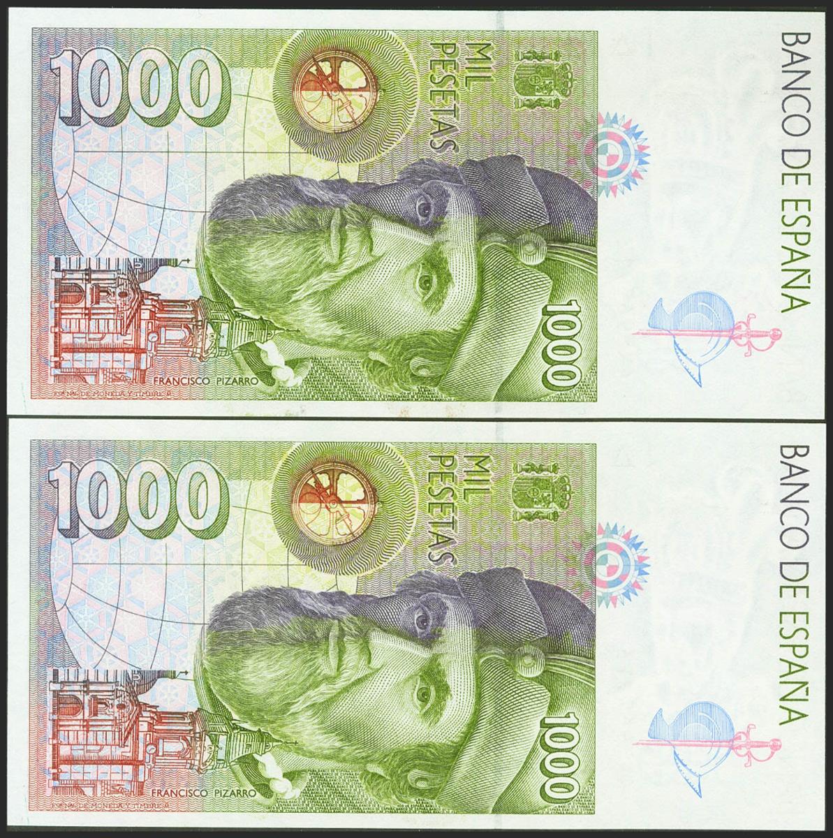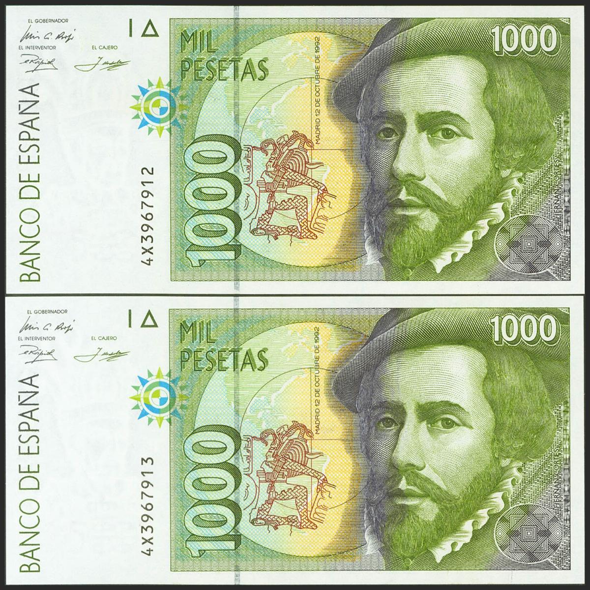 1000 pesetas. October 12, 1992. Correlative couple. 4X series. (Edifil 2021: 483b). Uncirculated.