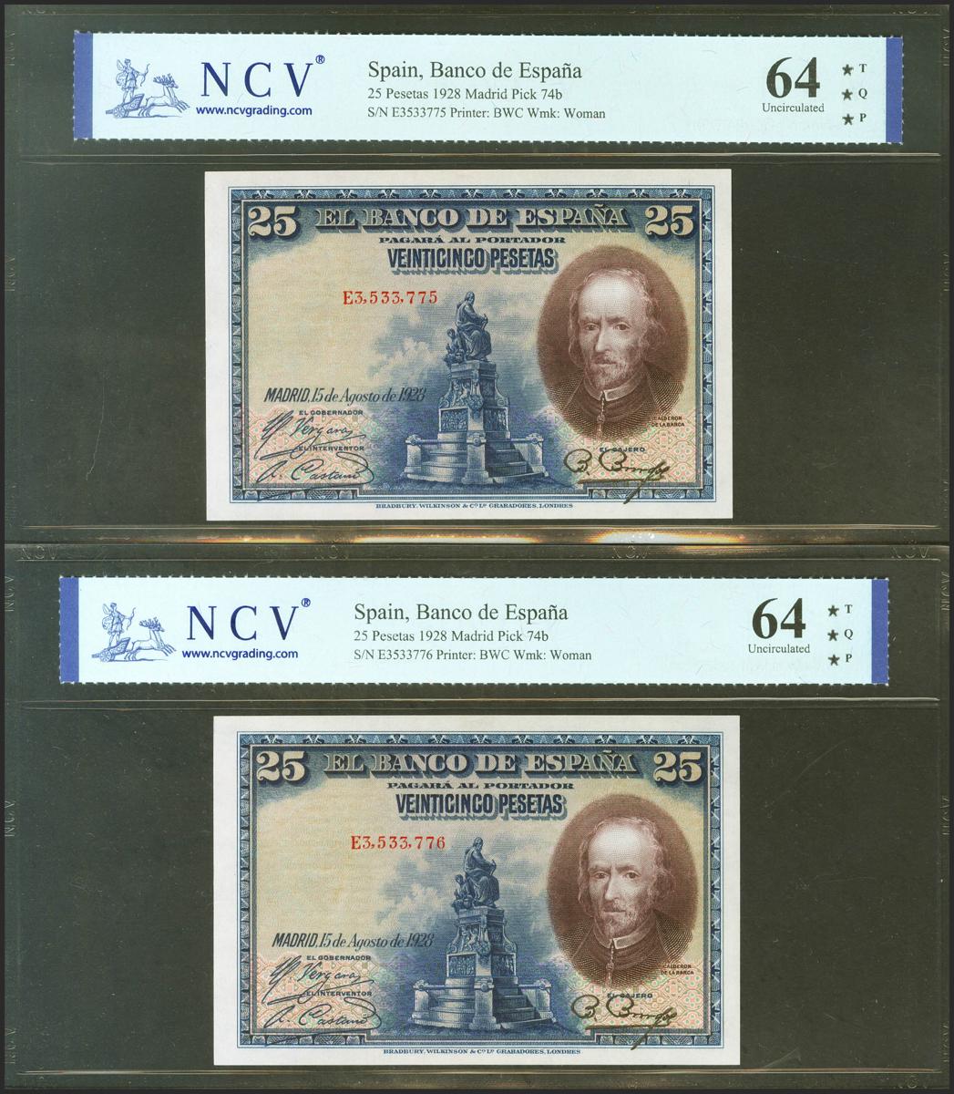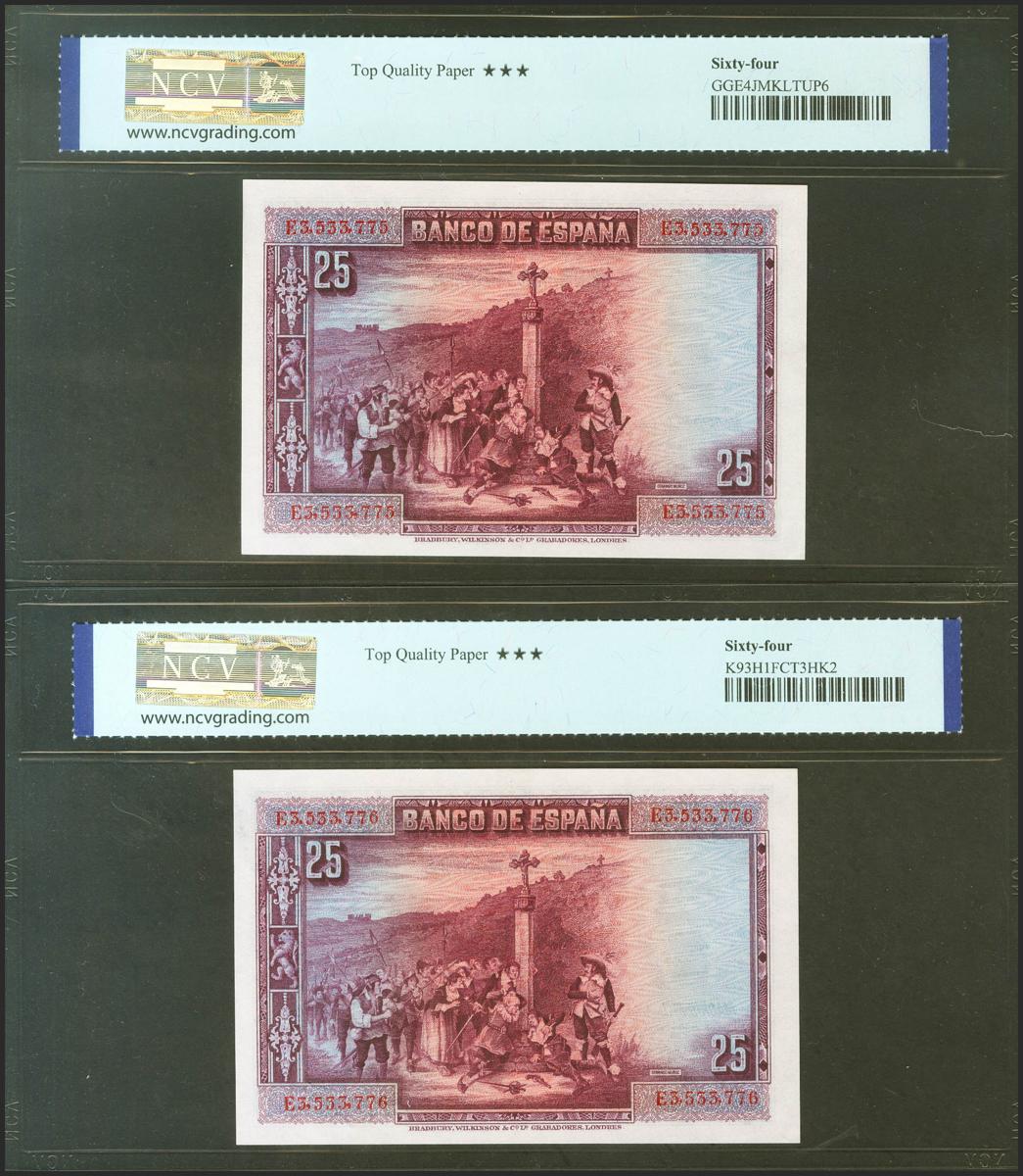 25 pesetas. August 15, 1928. Correlative couple. Series E. (Edifil 2021: 353, Pick: 74b). original sizing Uncirculated. NCV64TQP packages, both.