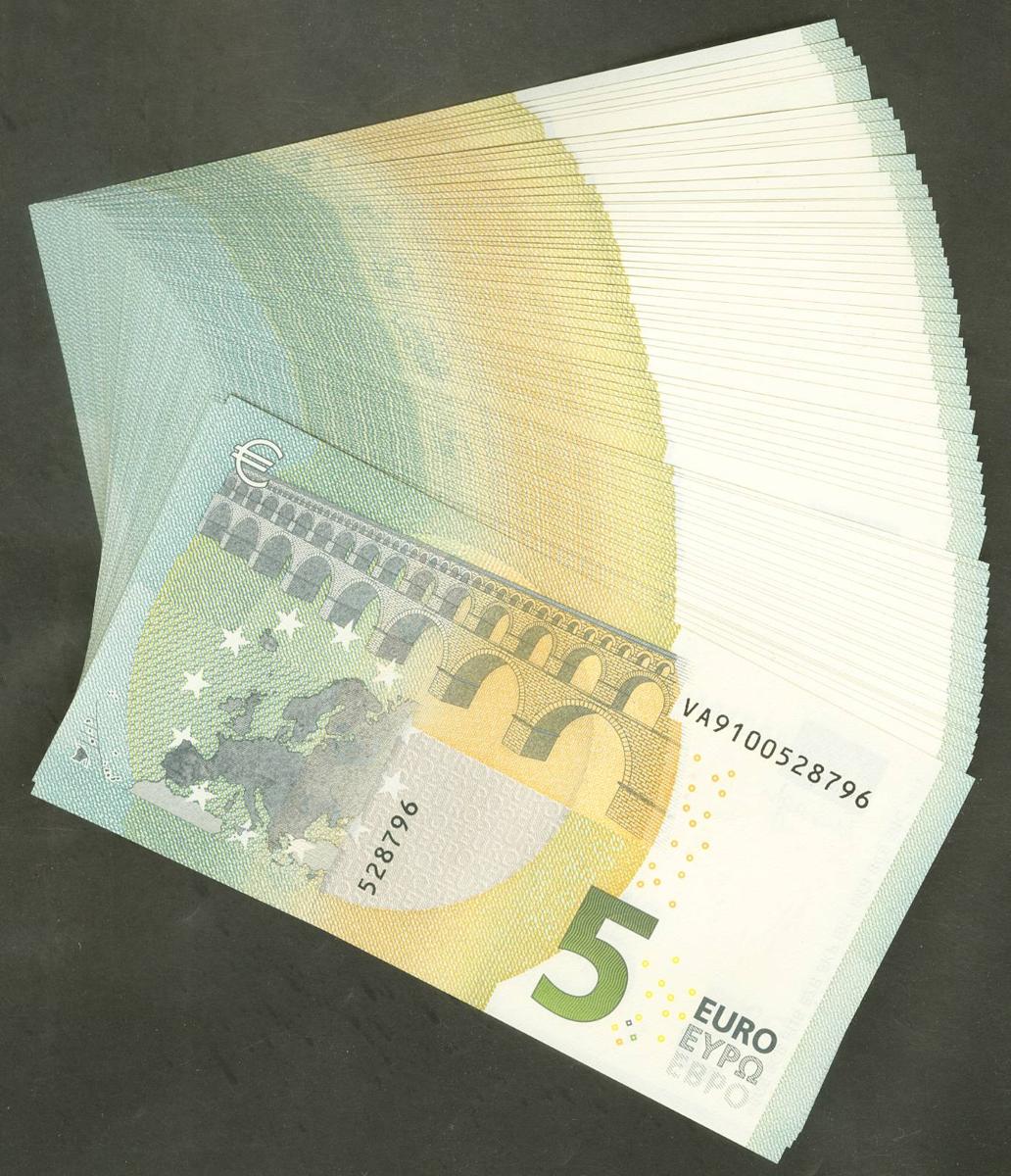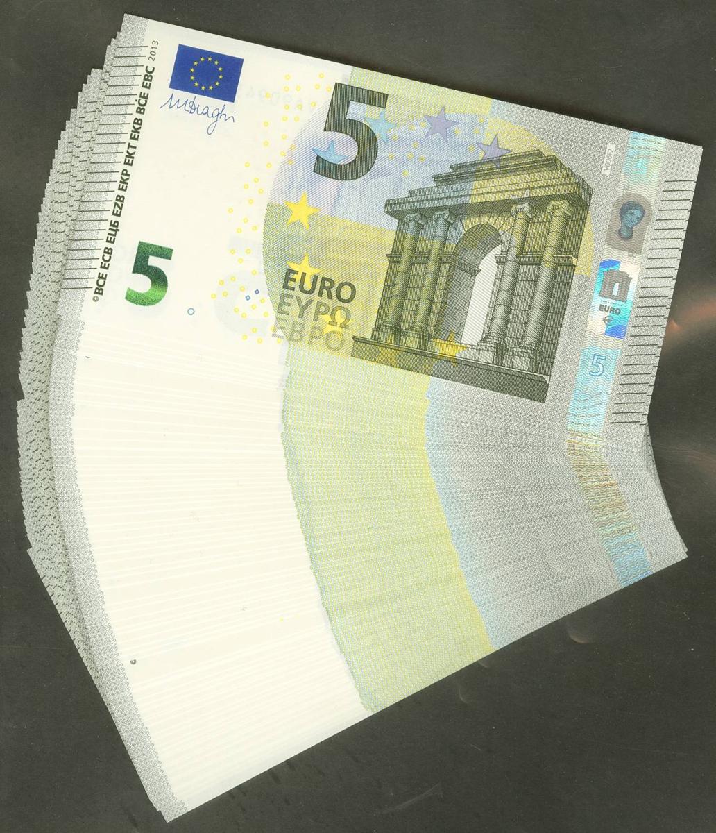 Set of 70 5-Euro banknotes, all of them correlative, issued on May 2, 2013, (it should be remembered that the last numbering digit of all euro-denominated banknotes is for internal control of the European Central Bank, which marks the correlativity of the banknotes is the penultimate digit) with the Draghi Signature and Series V (Spain), (Edifil 2021: 493). Uncirculated.