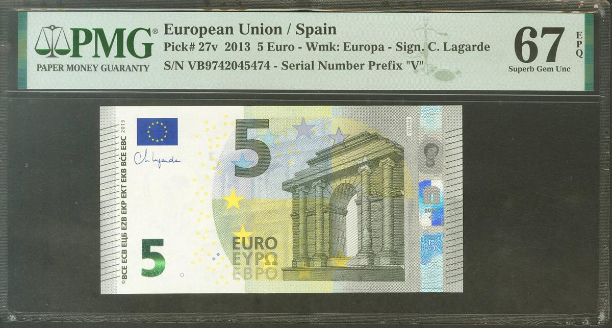 5 euros. May 2, 2013. Signature Lagarde. Series V (Spain). (Edifil 2021: 493A, Pick: 27v). Uncirculated. PMG67EPQ package.