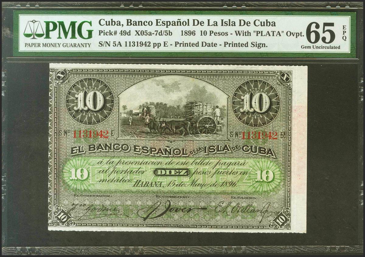 SPANISH BANK OF THE ISLAND OF CUBA. 10 pesos. May 15, 1896. SILVER surcharge, on the reverse. (Edifil 2021: 82, Pick: 49d). Unusual and original sizing. Uncirculated. PMG65EPQ package.