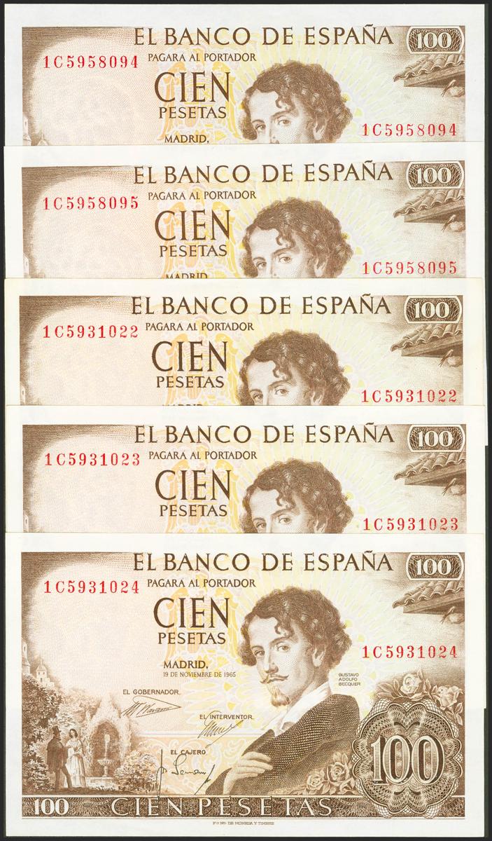 Set of 5 banknotes, including a trio and a couple, of 100 Pesetas issued on November 19, 1965, all of them with the 1C series (Edifil 2021: 470a), preserving the original sizing. Uncirculated/ Almost Uncirculated.
