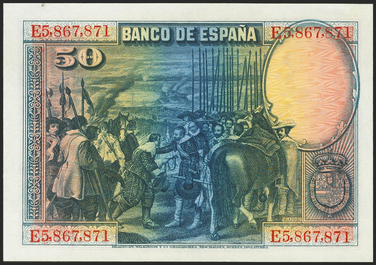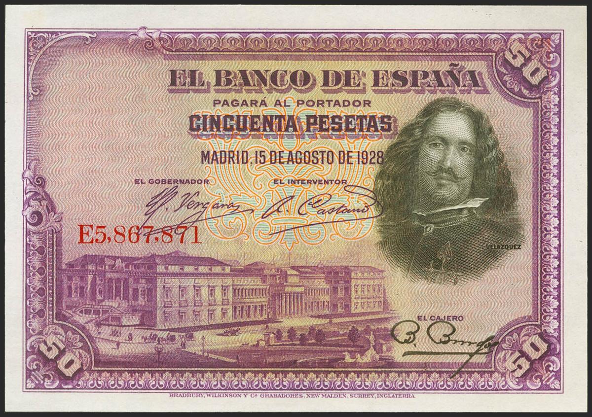 English 50 pesetas. August 15, 1928. Series E. (Edifil 2021: 354). original sizing Uncirculated.