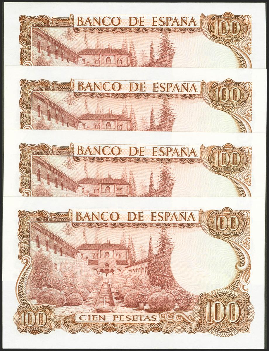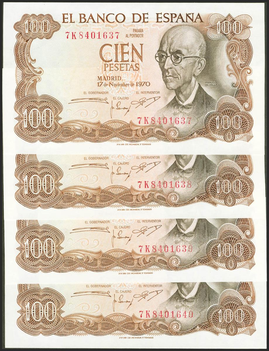 Set of 4 correlative banknotes of 100 Pesetas issued on November 17, 1970, all of them with the 7K series (Edifil 2021: 472c), original sizing. Uncirculated.