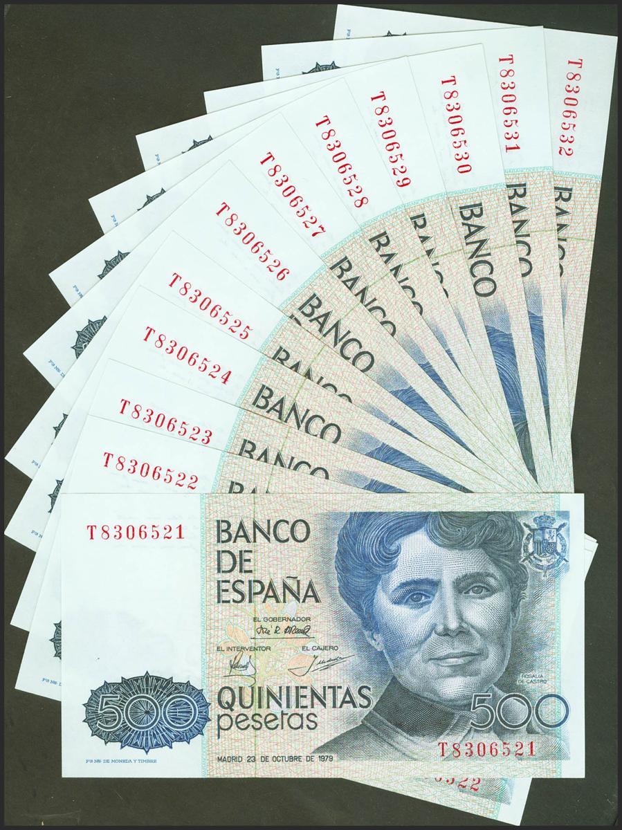 Set of 12 correlative banknotes of 500 Pesetas issued on October 23, 1979, all of them with the T series (Edifil 2021: 476a). Uncirculated.
