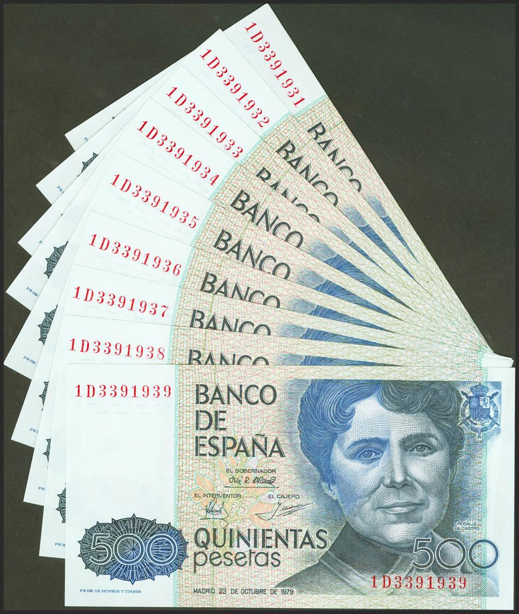 Set of 9 correlative banknotes of 500 Pesetas issued on October 23, 1979, all of them with the 1D series (Edifil 2021: 476a). Uncirculated.