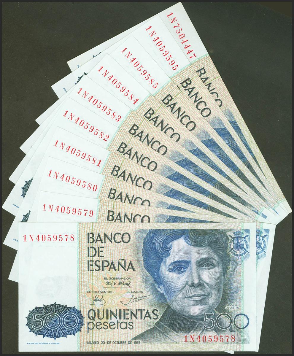 Set of 10 banknotes, including eight correlatives, of 500 Pesetas issued on October 23, 1979, all of them with the 1N series (Edifil 2021: 476a). Uncirculated/ Good Extremely Fine.