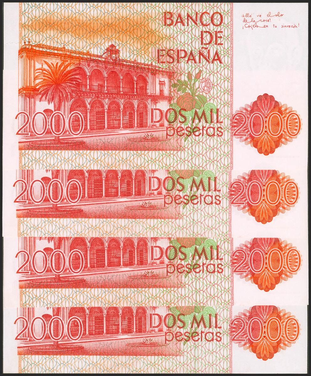 English Set of 4 correlative banknotes of 2000 Pesetas issued on July 22, 1980, all of them without series (Edifil 2021: 479). Good Extremely Fine/EBC++.