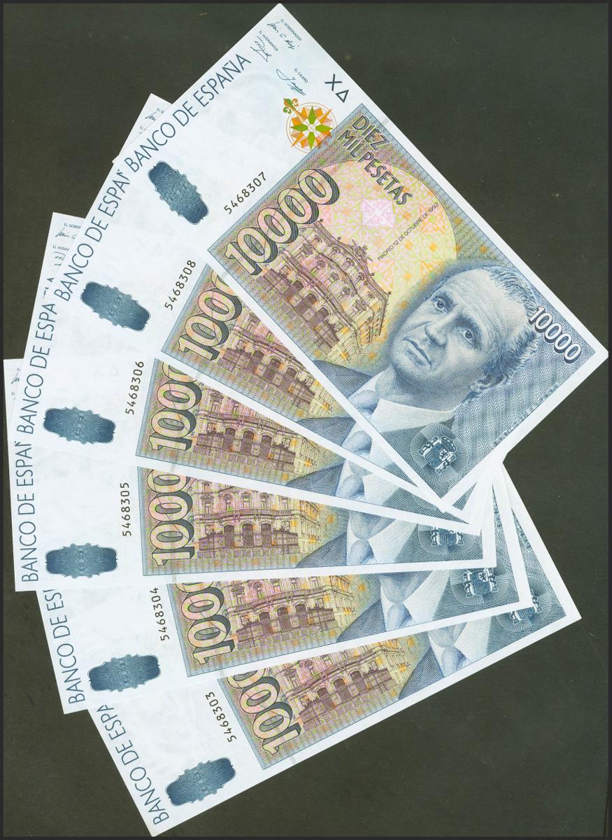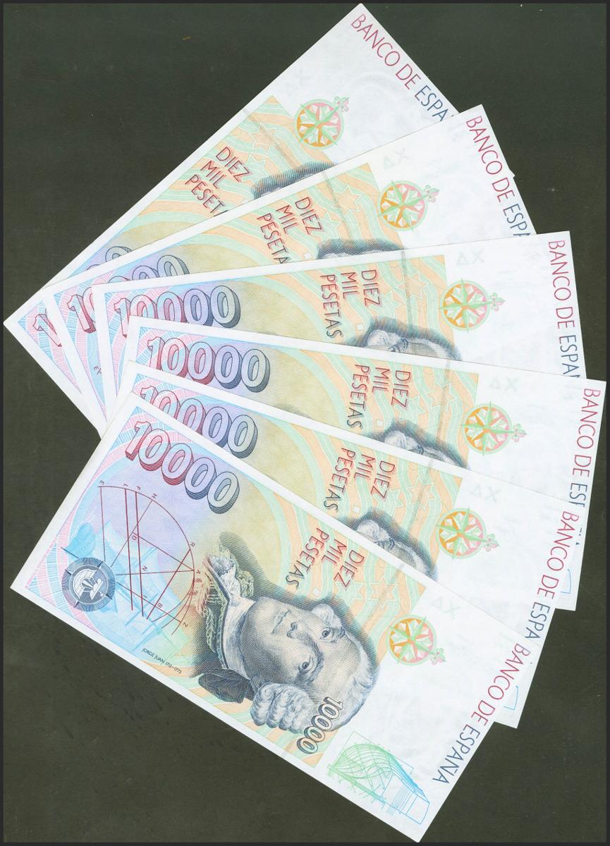 Set of 6 correlative banknotes of 10,000 Pesetas issued on October 12, 1992, all of them without series (Edifil 2021: 485). Uncirculated/ Almost Uncirculated.