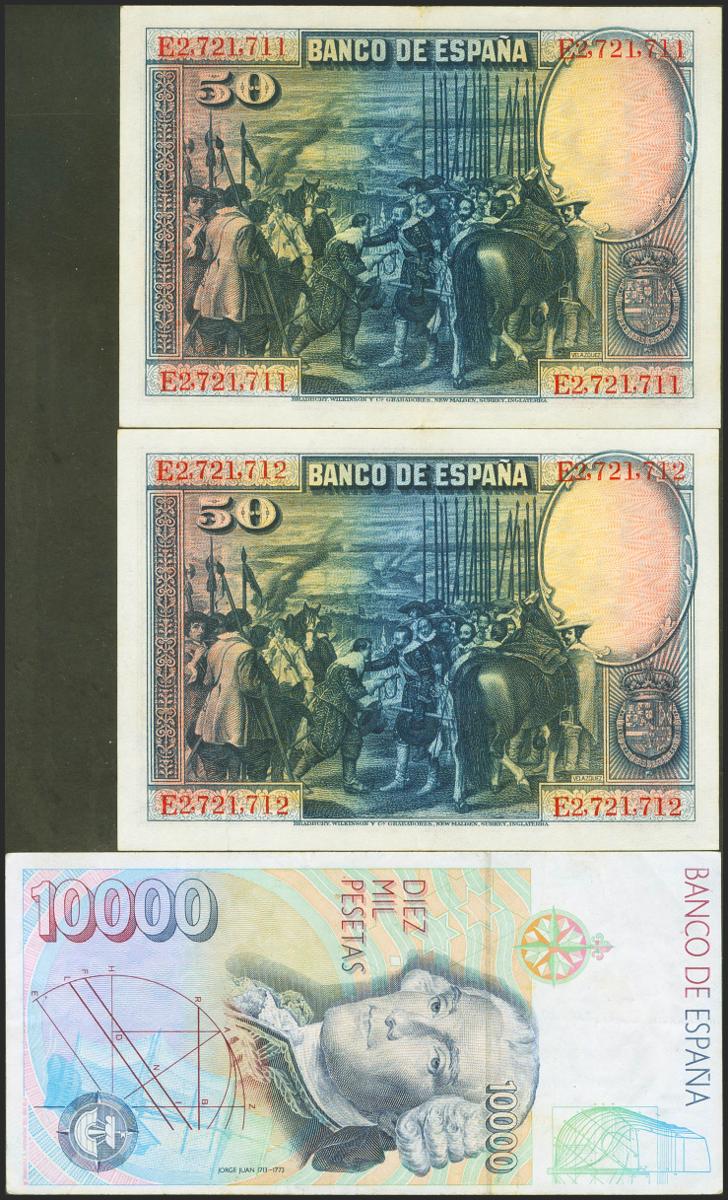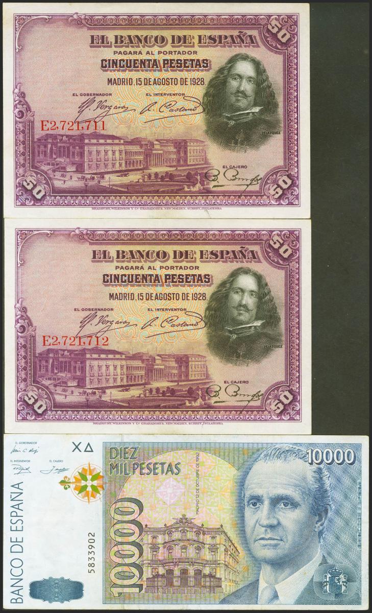 Set of three bills, two of them a correlative pair of 50 Pesetas, issued on August 15, 1928, with series E and a 10,000 Pesetas bill, issued on October 12, 1992, without series (Edifil 2021: 354, 481) . Extremely Fine/ Good Very Fine.