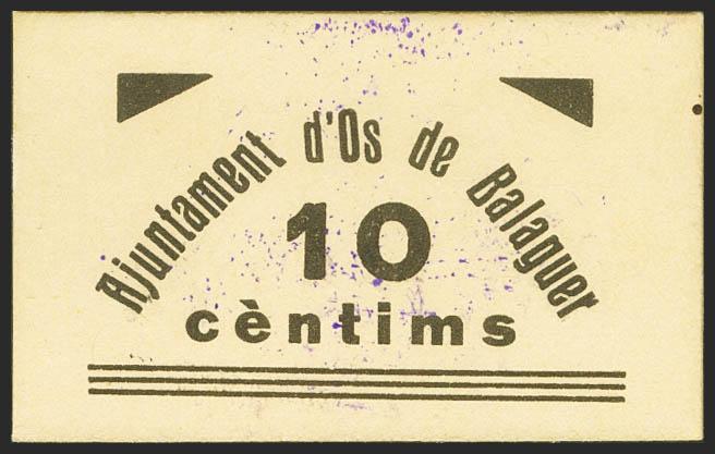 OS DE BALAGUER (LERIDA). 10 cents. (1937ca). (Gonzalez: 9056). Very rare. Extremely Fine.