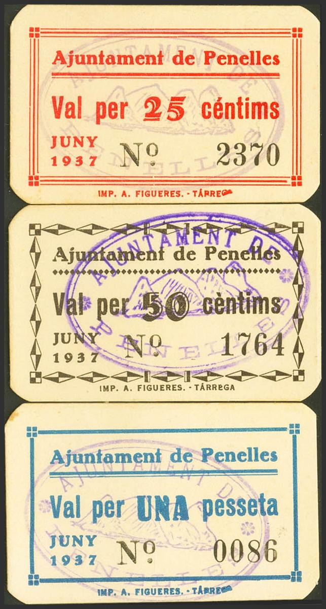 PENELLES (LERIDA). 25 Cents, 50 Cents and 1 Peseta. June 1937. (González: 9183/85). Very rare in this exceptional quality. Uncirculated.
