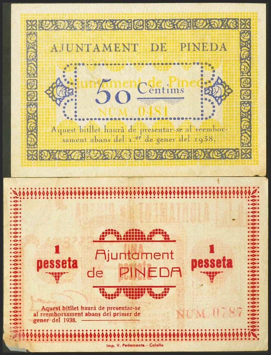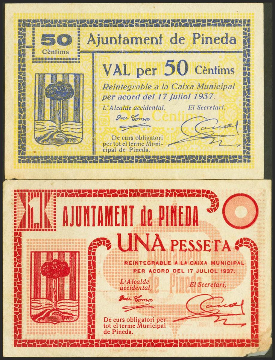 PINEDA (BARCELONA). 50 Cents and 1 Peseta. July 17, 1937. (González: 9216, 9217). rare. Almost Extremely Fine/ Good Very Fine.