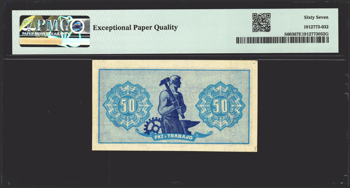 50 cents. 1937. Asturias and Leon. Without series and very low numbering. (Edifil 2021: 396, Pick: S603). Extremely rare, especially in this exceptional quality, original sizing. Uncirculated. PMG67EPQ package. (to give us an idea of the rarity, as of April 1, 2023, the ticket is the best rated in PMG)