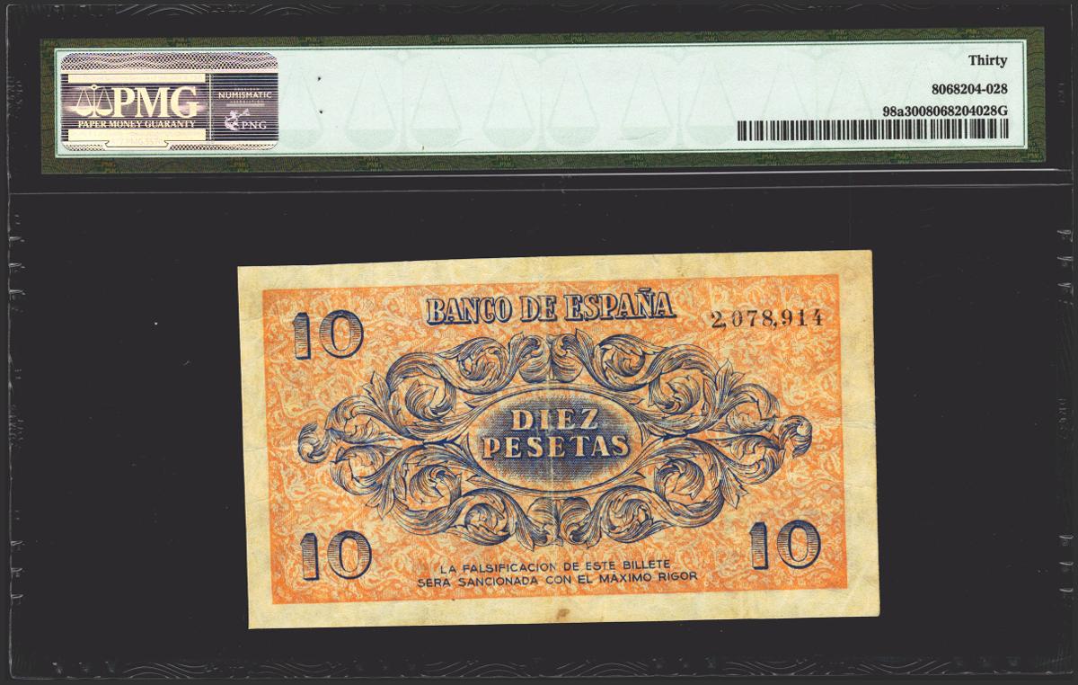 10 pesetas. November 21, 1936. No series. (Edifil 2017: 418, Pick: 98a). Rare, especially without any repairs. Very Fine. PMG30 package.