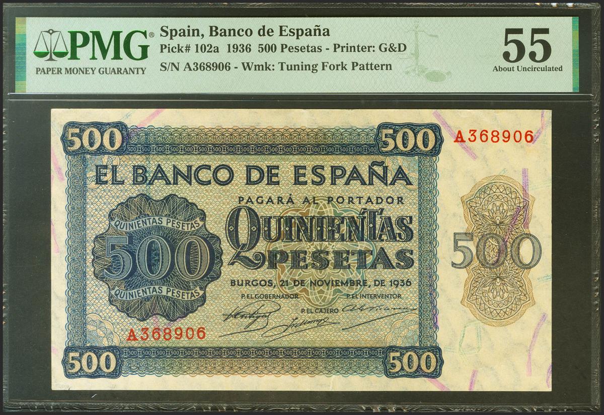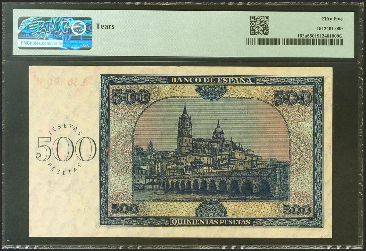 500 pesetas. November 21, 1936. Series A. (Edifil 2021: 422a). Unusual. Good Extremely Fine. PMG55 package.