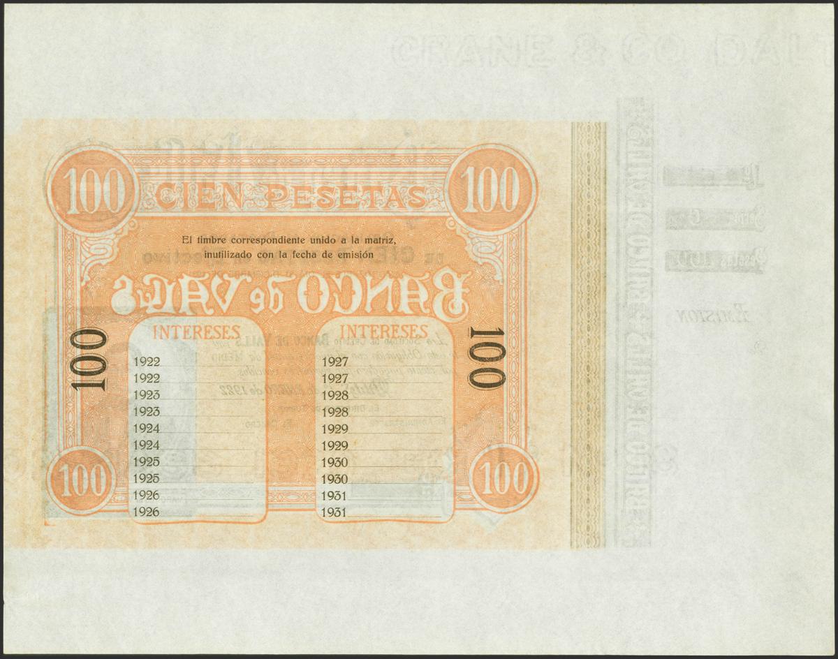 100 pesetas. January 1, 1922. Bank of Valls. Series C, without numbering, without signatures and with matrix. (Ruiz and Alentorn: not listed). Almost Uncirculated.