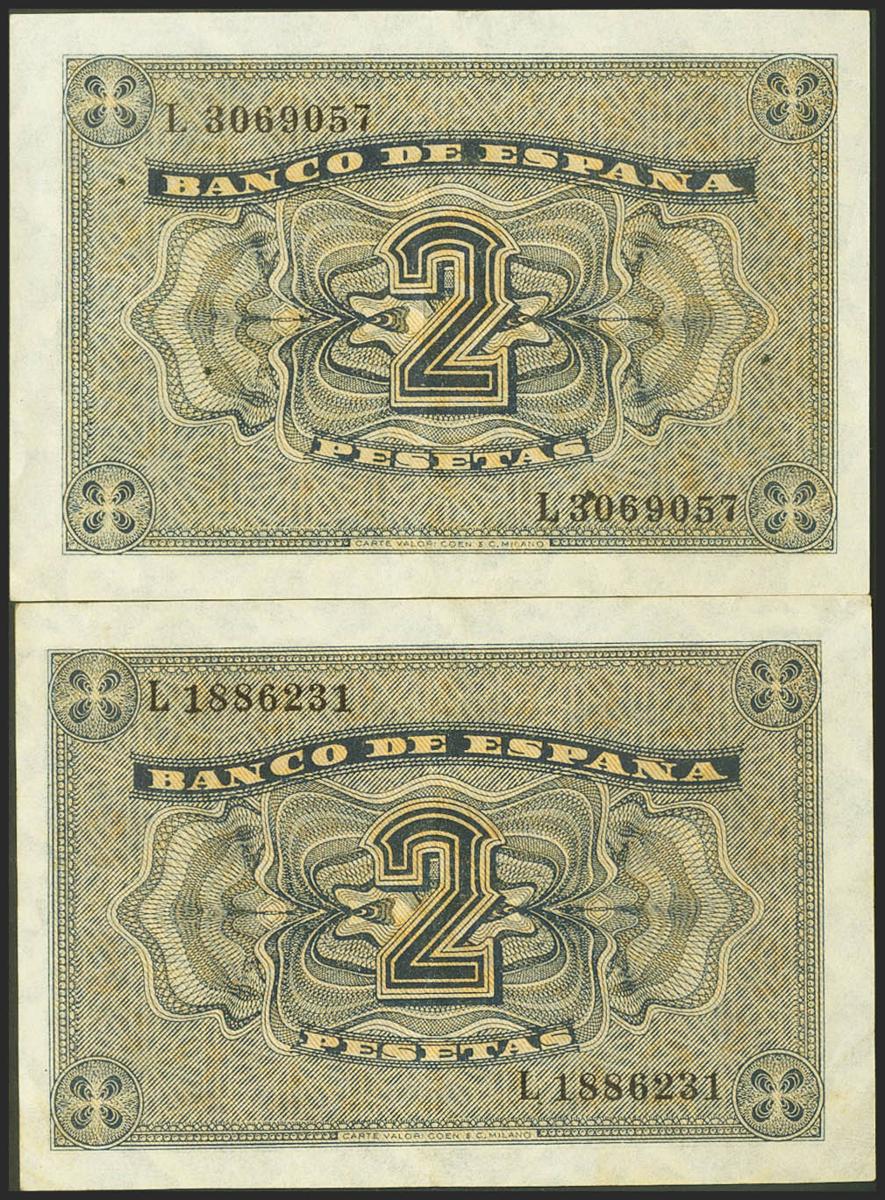 Set of 2 2 Pesetas banknotes issued on April 30, 1938, both with the L series (Edifil 2021: 429a), retaining part of their original size. Almost Extremely Fine.