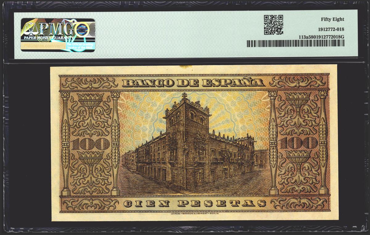 100 pesetas. May 20, 1938. Series A. (Edifil 2021: 432, Pick: 113a). EBC++. PMG58 encapsulation.