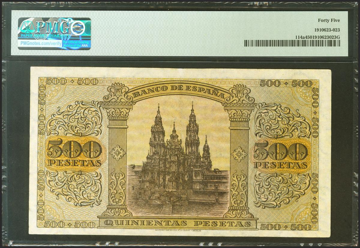 500 pesetas. May 20, 1938. Series A. (Edifil 2021: 433, Pick: 114a). Unusual. Almost Extremely Fine. PMG45 package.