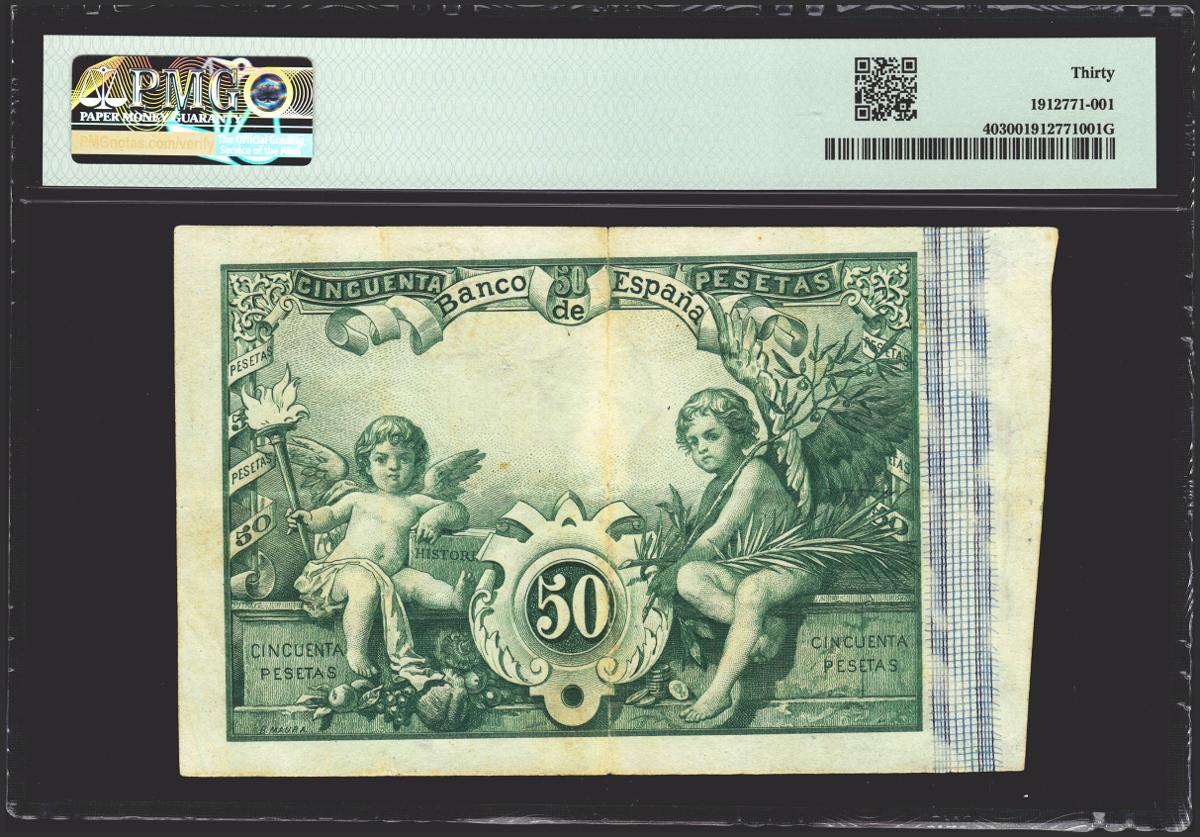 50 pesetas. June 1, 1889. Series A. (Edifil 2021: 298, Pick: 40). Very rare especially without repairs and in this quality. Good Very Fine. PMG30 package.