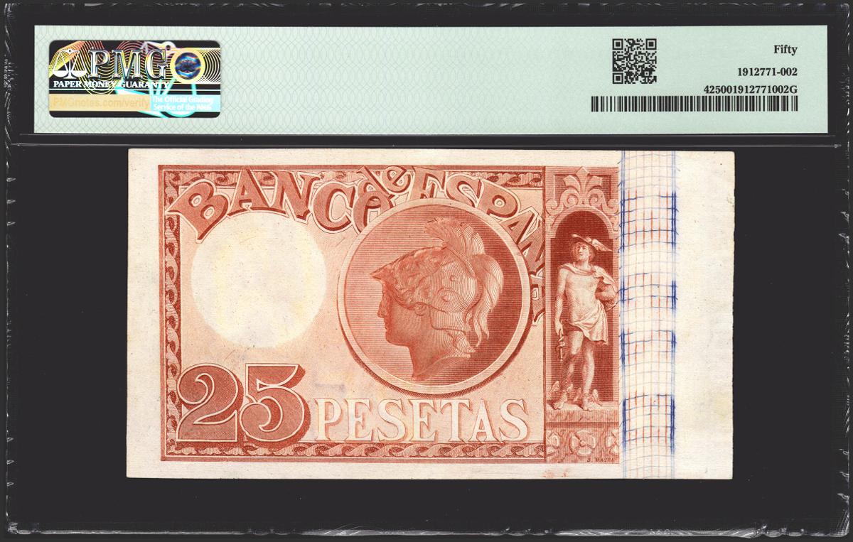25 pesetas. July 24, 1893. Without series. (Edifil 2021: 300, Pick: 42). Rare especially in this high quality and without any repair. Extremely Fine. PMG50 package. (to give us an idea of the rarity, as of April 1, 2023, this bill is the second highest rated along with another bill in PMG)