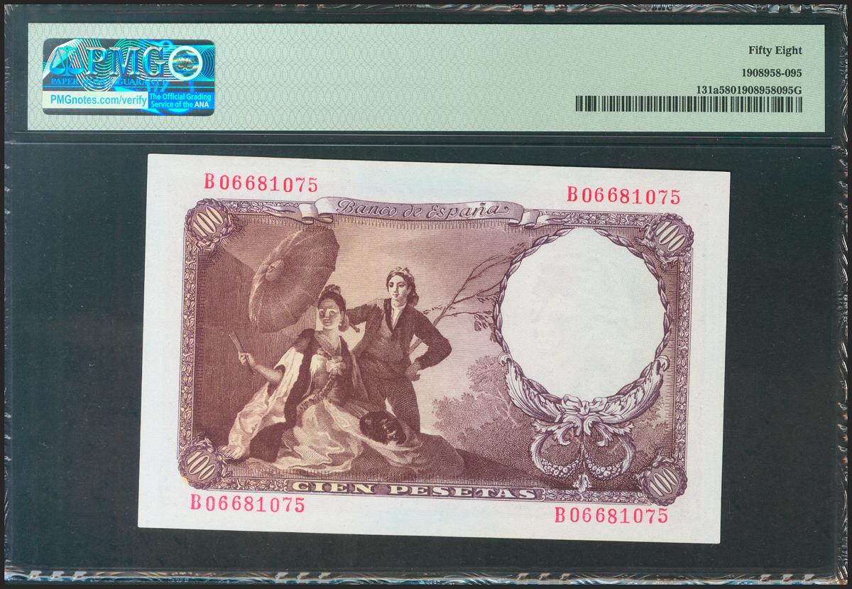 100 pesetas. February 19, 1946. Series B. (Edifil 2021: 451, Pick: 131a). EBC++. PMG58 encapsulation.